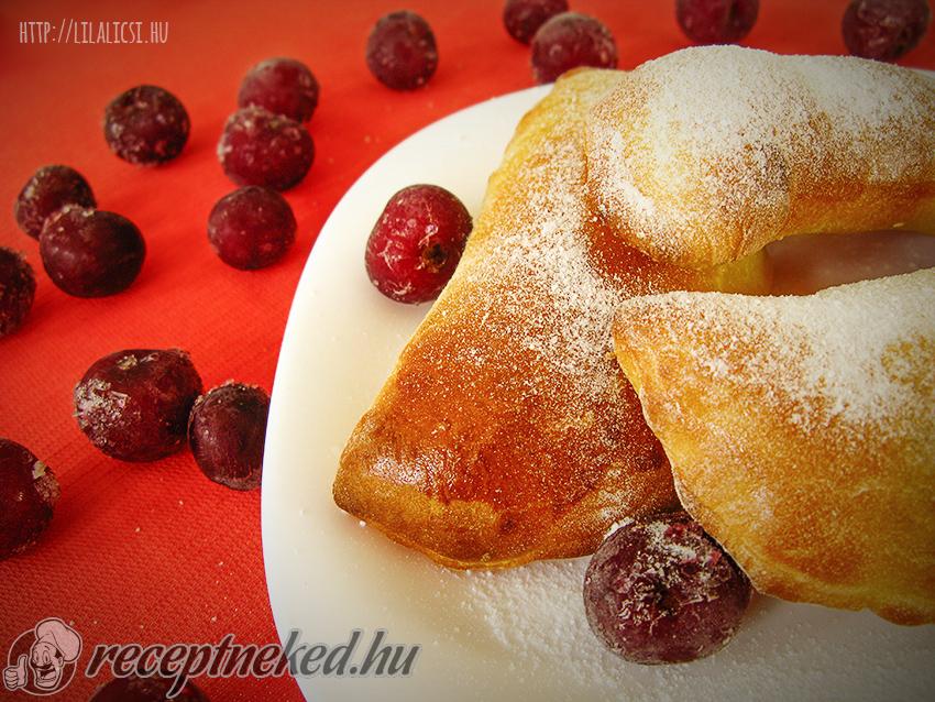 Egyenként alakítsunk ki a kezünkkel, nagyjából 10 cm-es körformát, tegyünk a közepébe egy evőkanál meggylekvárt, majd hajtsuk össze a tésztát, a széleit nyomkodjuk szorosan össze. Egy egész tojást verjünk fel, ezzel kenjük le a tészta tetejét, és 10-15 percre pihentessük.