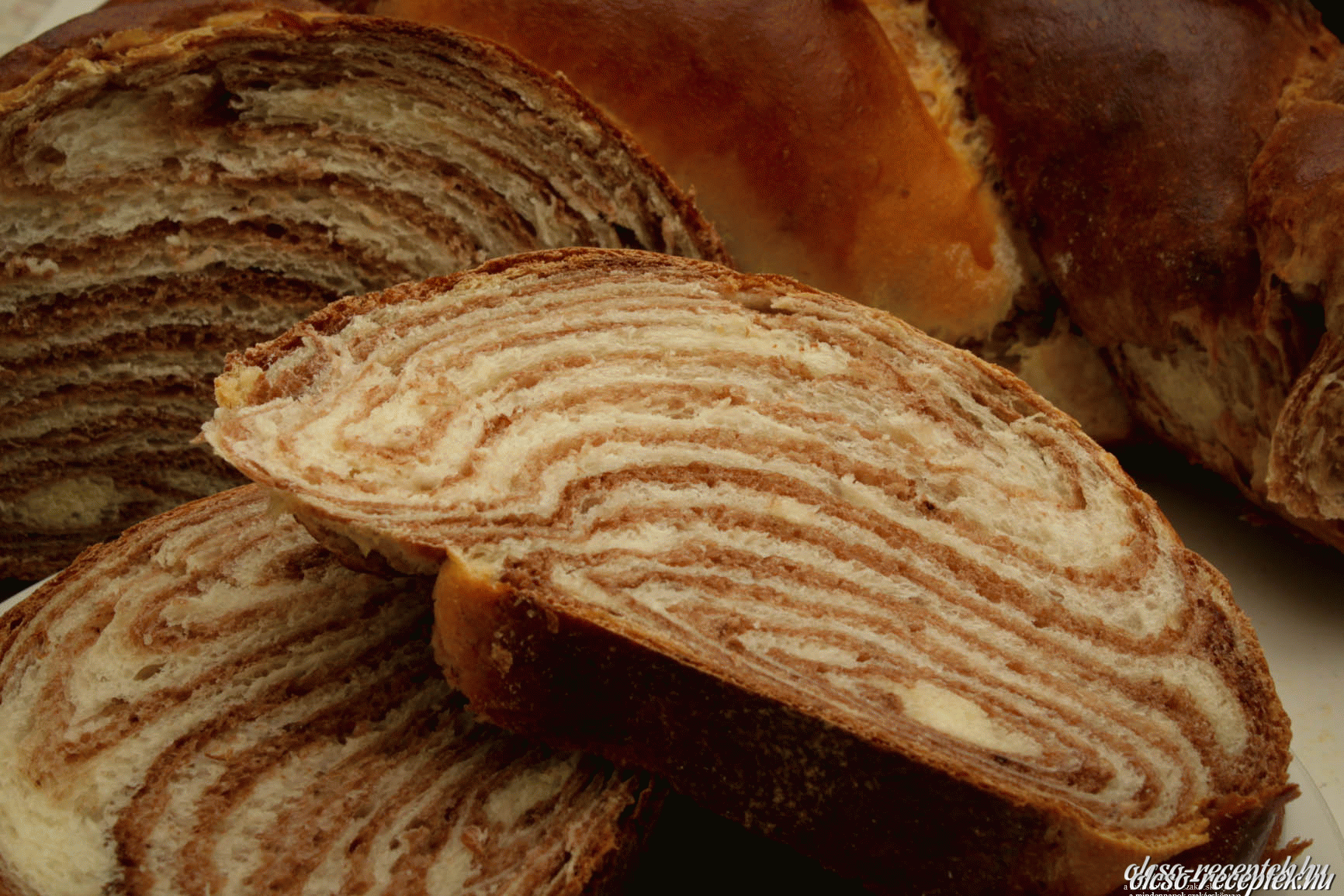 Amikor a tészta megkelt, kettéosztjuk. Az egyik felébe belegyúrjuk a vízzel elkevert kakaóport. A kakaós tésztát két részre osztjuk, és az egyik darabot 20×40 cm-es téglalappá nyújtjuk. A fehér tésztával is ugyanígy járunk el: kettévesszük, kinyújtjuk, majd a kinyújtott barna lapra helyezzük. Nyújtófával kissé összenyomjuk a két réteget, majd feltekerjük, mint egy bejglit.