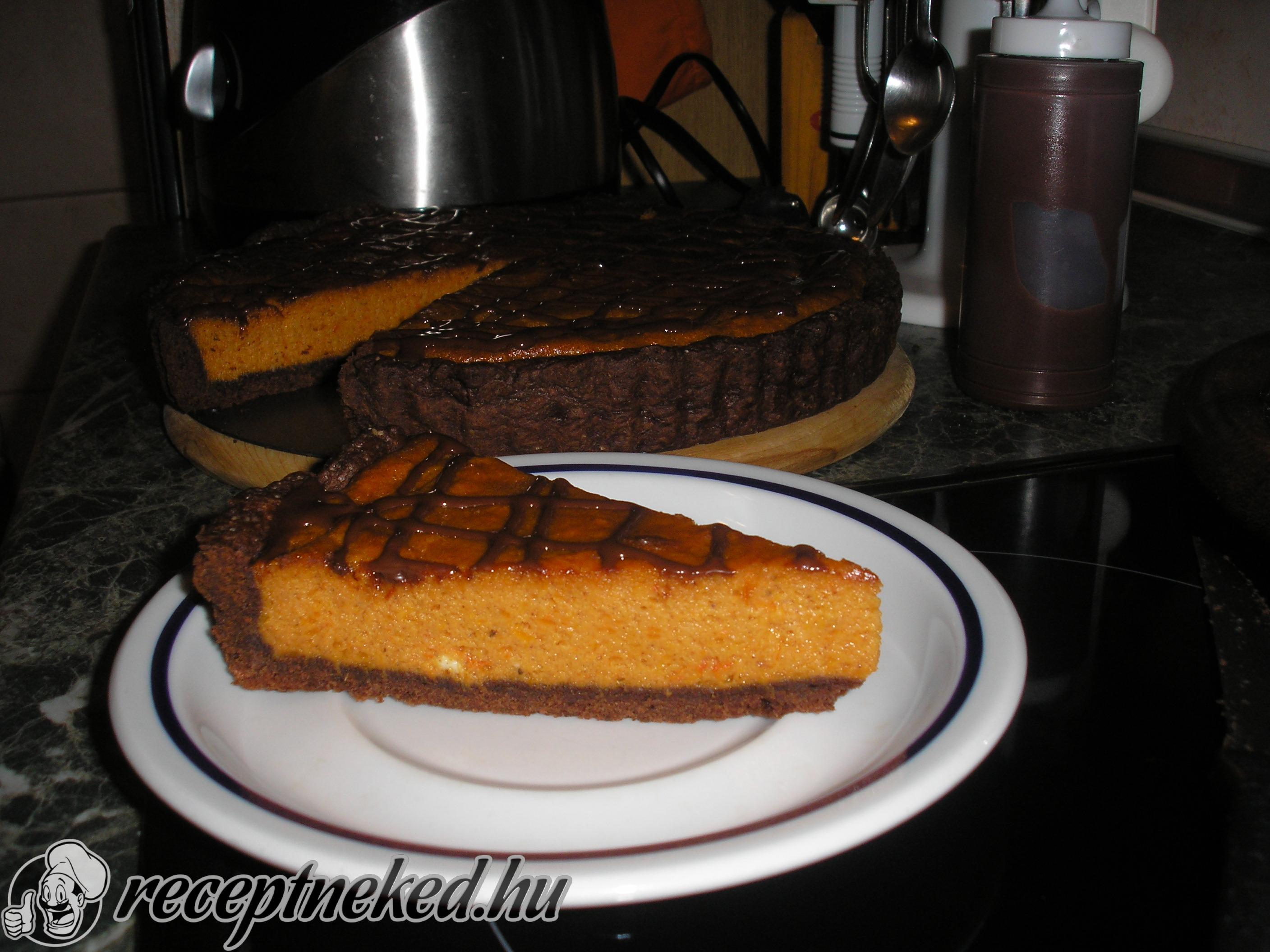 Miután kihűlt, lecsatoljuk az oldalát és csokival vonjuk be a tortát. Ehhez egy kisebb lábasban összeforraljuk a kristálycukrot 3 cl vízzel, feloldjuk benne az étcsokoládét, jól összekeverjük és bevonjuk vele a pitét.
