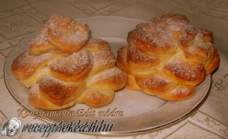 Kelés után a tésztát a kelesztőtálból lisztezett felületre öntjük, átgyúrjuk majd 12 egyenlő részre osztjuk. A tészták közepébe az ujjunkkal mélyedést formázunk és a töltelékkel megtöltjük.