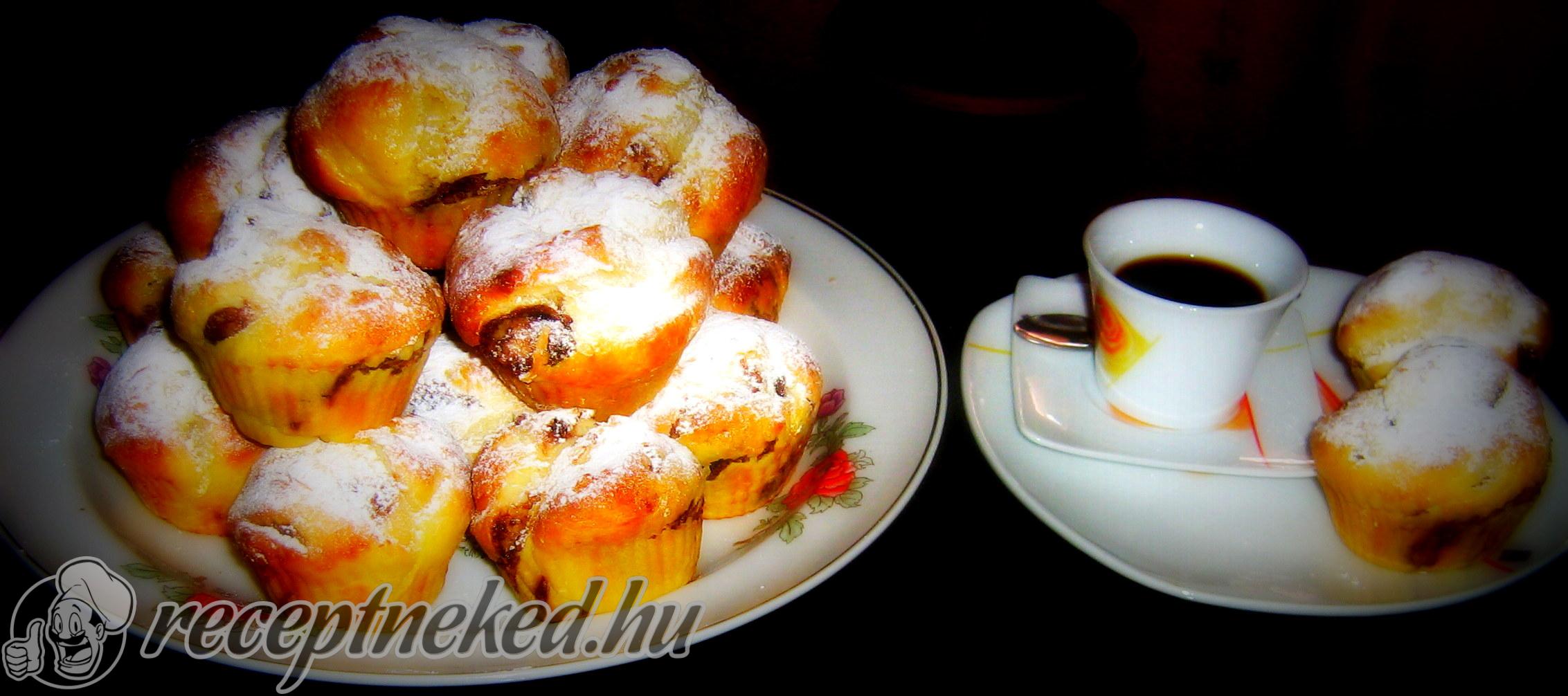 Ezt követően a tölteléket belecsomagoljuk a tésztába és kb 14*8 cm nagyságúra nyújtjuk. Egy késsel a hosszanti oldallal párhuzamosan öt egyforma csíkot vágunk, úgy, hogy a két széle egyben maradjon, majd ellentétes irányban megcsavarjuk és mint a csigát, feltekerjük. Kivajazott muffinformába rakjuk.
