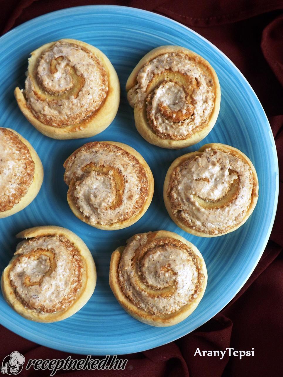 A tésztát lisztezett felületen téglalap alakúra elnyújtjuk, ami nekem kb. 25*30 cm lett. Egyenletesen elkenjük rajta a diós habot