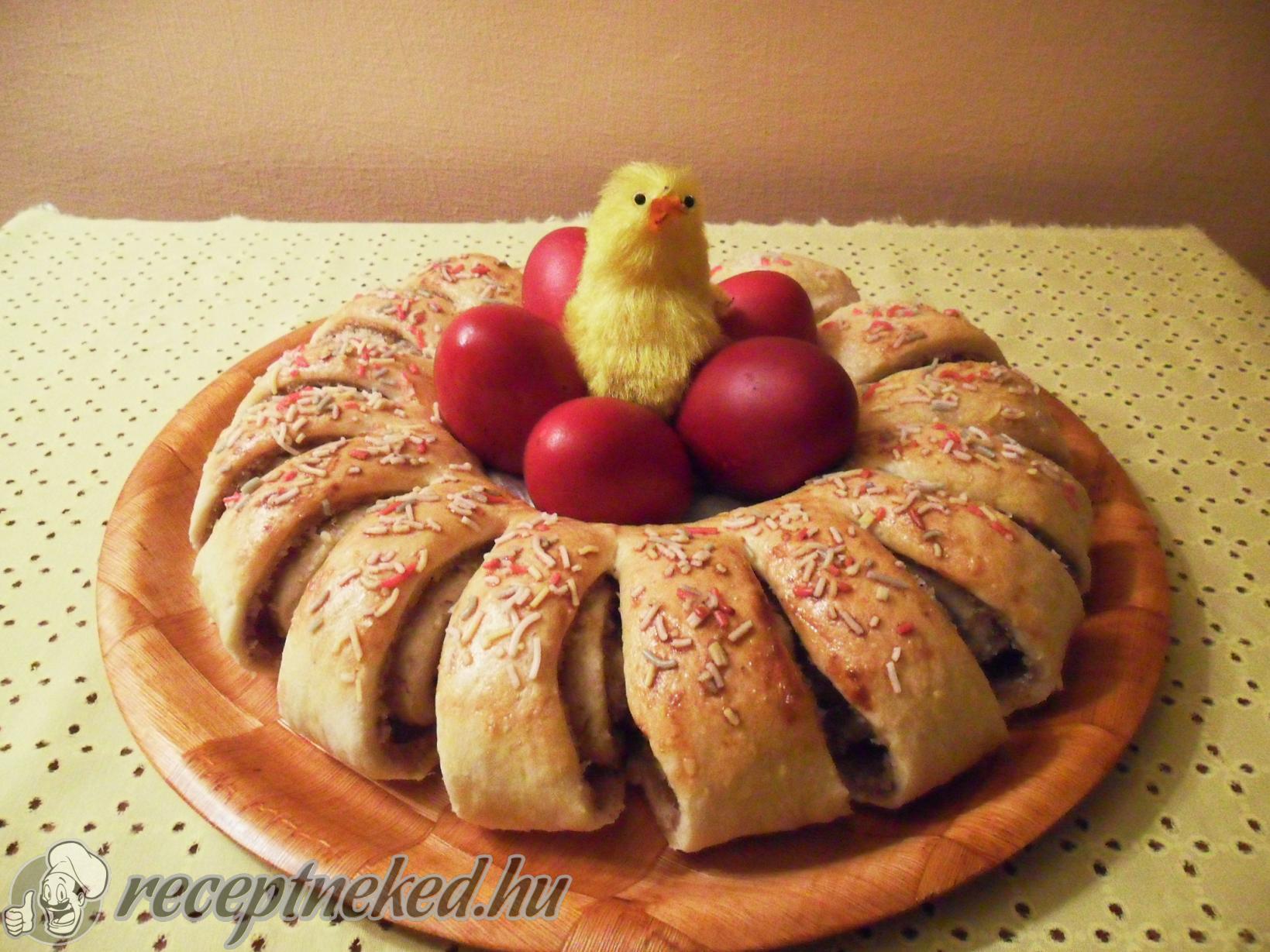 Másnap a tésztát átgyúrjuk és téglalap alakúra nyújtjuk. Megkenjük a lekvárral, majd egyenletesen megszórjuk a porcukorral elkevert darált dióval. A tésztát feltekerjük, és kivajazott kuglófformába helyezzük.