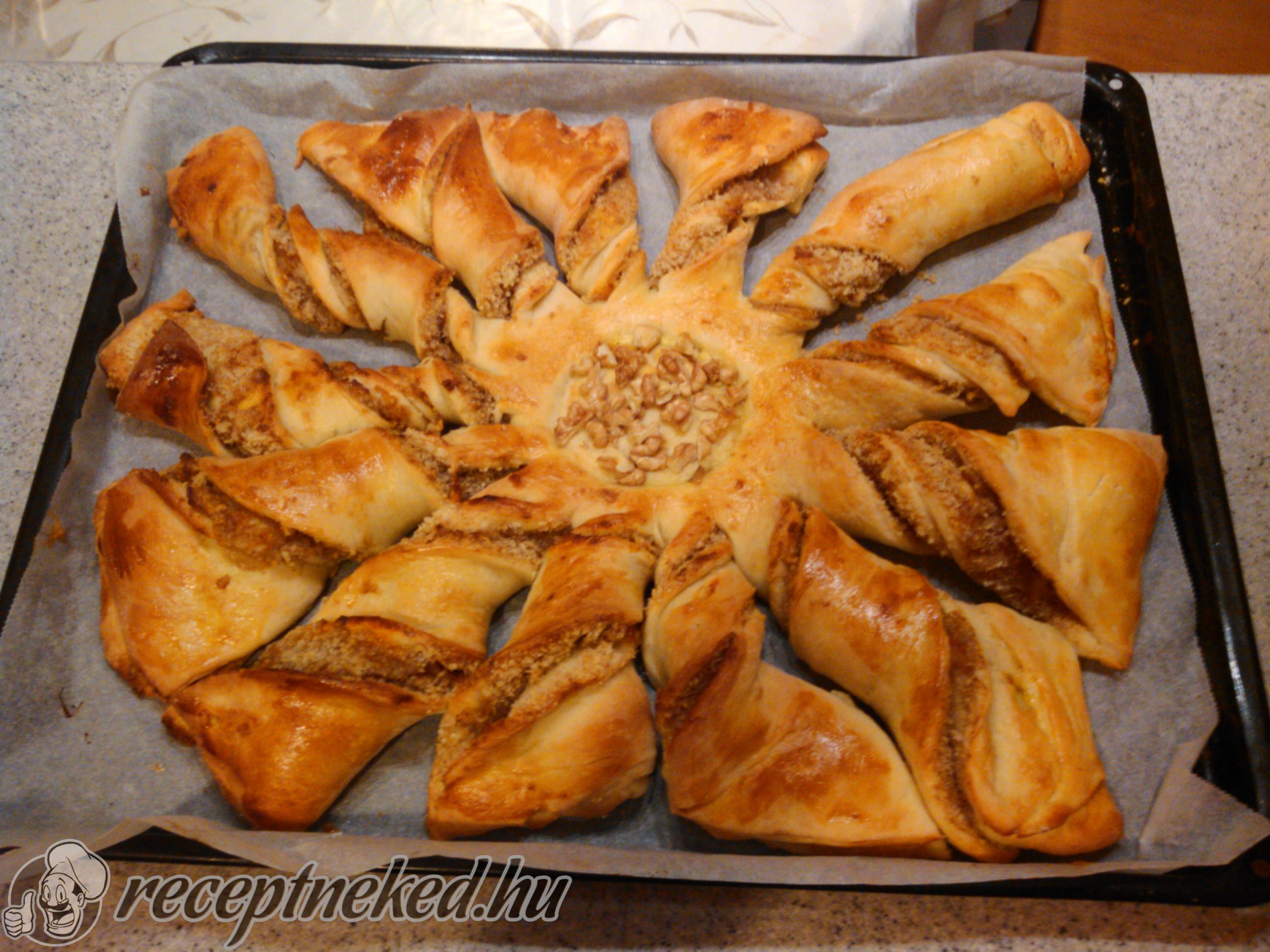 A tésztát pizzához hasonlóan cikkekre vágjuk, majd a szeleteket 2–3-szor megcsavarjuk, hogy napraforgóra emlékeztető formát kapjunk. A tetejét felvert tojással megkenjük.