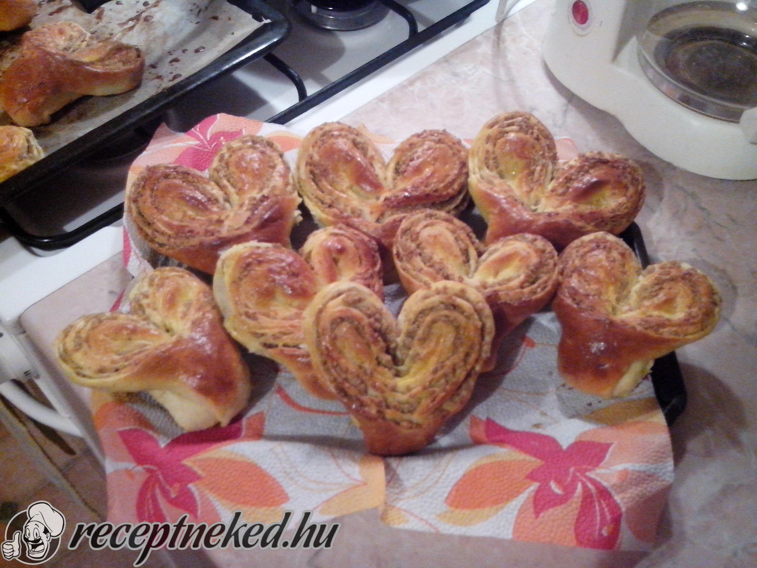 A kis gömböket lisztezett deszkán kinyújtjuk kör alakúra, majd megkenjük a töltelékkel. Feltekerjük, mint a palacsintát, félbehajtjuk és a felső részénél egy éles késsel félbevágjuk, úgy, hogy alul 2 cm egyben maradjon, majd mindkét szárnyát kifelé fordítjuk.
