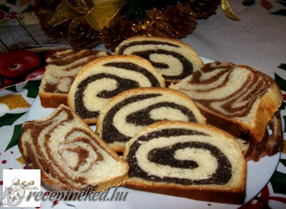 A megkelt tésztát elfelezzük. Téglalap alakúra nyújtjuk a tésztákat és az egyiket megkenjük a diós töltelékkel, feltekerjük, majd a másik tészta következik a mákkal, majd feltekerjük a tésztákat.