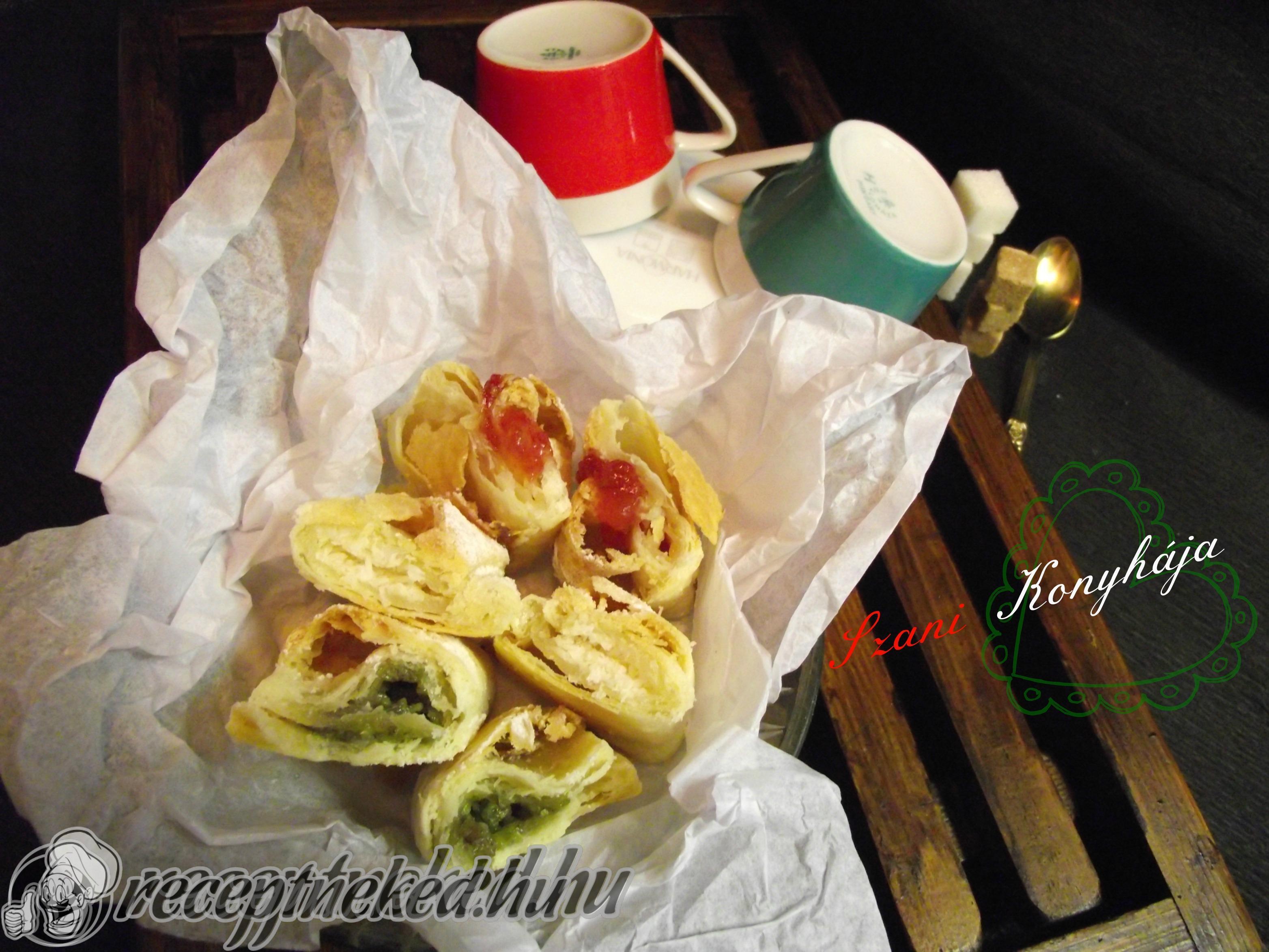 Következik az utolsó nyújtás, amikor már töltjük a süteményünket dióval, lekvárral vagy amivel szeretnénk. Kinyújtjuk kb 7-8 mm vastagra a szép, hólyagos tésztánkat, feldaraboljuk négyzet alakúra. Megtöltjük a közepét és ráhajtjuk a másik felét.
