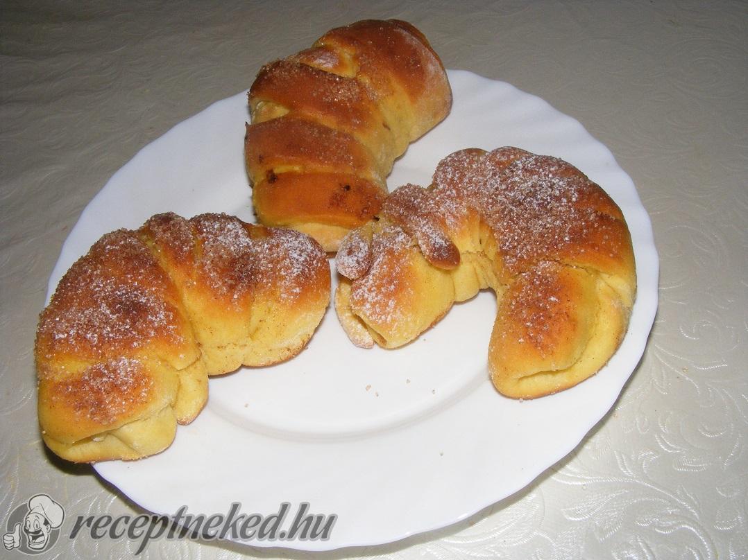 A töltelékhez a fahéjat és a cukrot összekeverjük. Minden háromszög tészta közepére hosszában egy csík tölteléket helyezünk, majd a háromszög csúcsától kezdve feltekerjük. Amikor a bevagdosott részhez érünk, ügyeljünk rá, hogy a csíkok a sütemény alá kerüljenek. A feltekert tésztát kifli formára hajlítjuk, és sütőpapírral bélelt tepsibe tesszük. A kifliket további 20-25 percig kelesztjük.