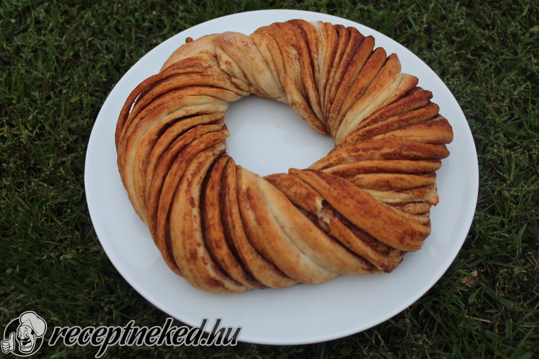 A vajat megolvasztjuk, majd összekeverjük a cukorral és az őrölt fahéjjal. A vajas keverék felével megkenjük a tésztát, majd feltekerjük. Hosszában félbe vágjuk. A vágott felükkel kifelé szorosan egymás mellé tesszük őket. Az egyik végén összefogjuk, majd megcsavarjuk úgy, hogy a vágott felek felfelé/kifelé nézzenek. A végét összefogjuk és koszorúvá alakítjuk.