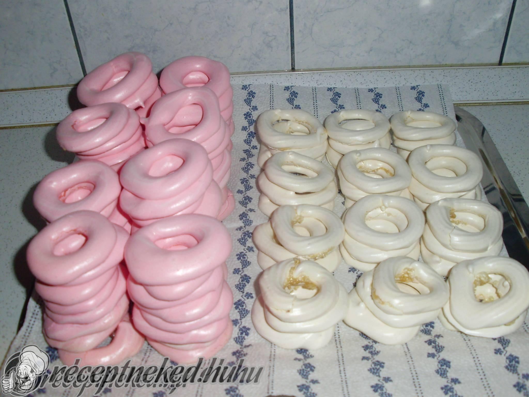 A tojásfehérjét elkezdjük felverni. Amikor már kicsit habos, elkezdjük a cukrot adagolni hozzá kanalanként majd 2 perc elteltével tesszük a hozzá következő adag cukrot. Addig rakjuk így bele cukrot, amíg el nem fogy a cukor, majd hozzáadjuk a keményítőt vagy a szirupot, amit óvatosan beledolgozunk a habba.