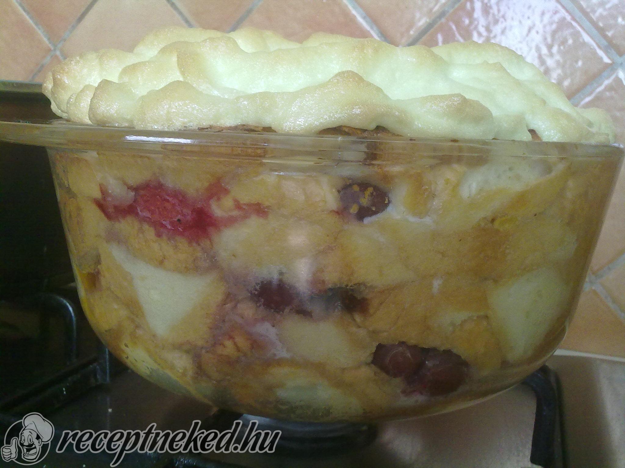 A gyümölcs tetejére szintén 1 réteg kifli, a kiflik tetejére teszünk egy kevés margarint. Ezt addig rétegezzük, amíg a tál megtelik, a teteje kifli legyen.