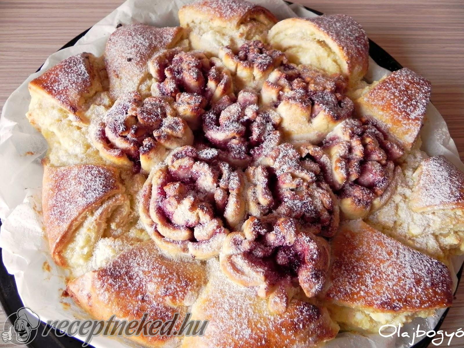 A másik tésztadarabot szintén kinyújtjuk, megkenjük a túrós töltelékkel, majd feltekerjük és háromszög alakú darabokra vágjuk (10–12 szelet). Ezeket a lekváros rózsák köré rendezzük.