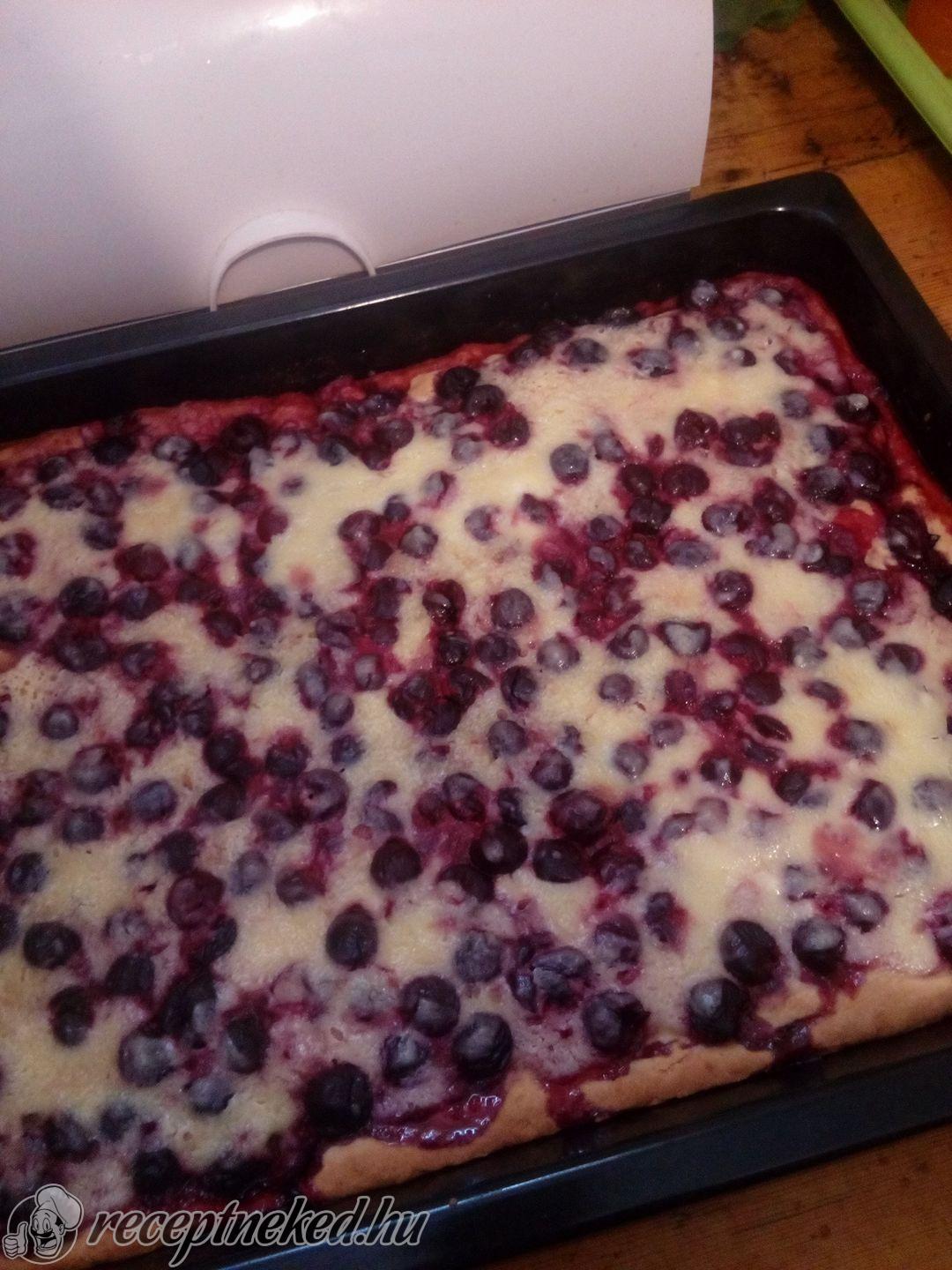 A tejfölt kikeverjük a cukorral és a tojássárgákkal, majd a meggyre locsoljuk. 20-25 percig kelesztjük.