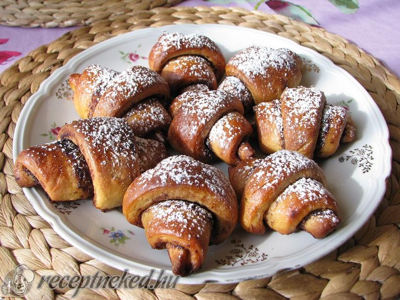 Közben a maradék vajat (5 dkg) és a cukrot (4 dkg) kihabosítjuk, és ezzel a keverékkel megkenjük a tésztát, majd beszórjuk a kakaóval. Nyolc egyenlő darabra (háromszögre) vágjuk, és pékkifliket (sima kiflit) formázunk belőle.