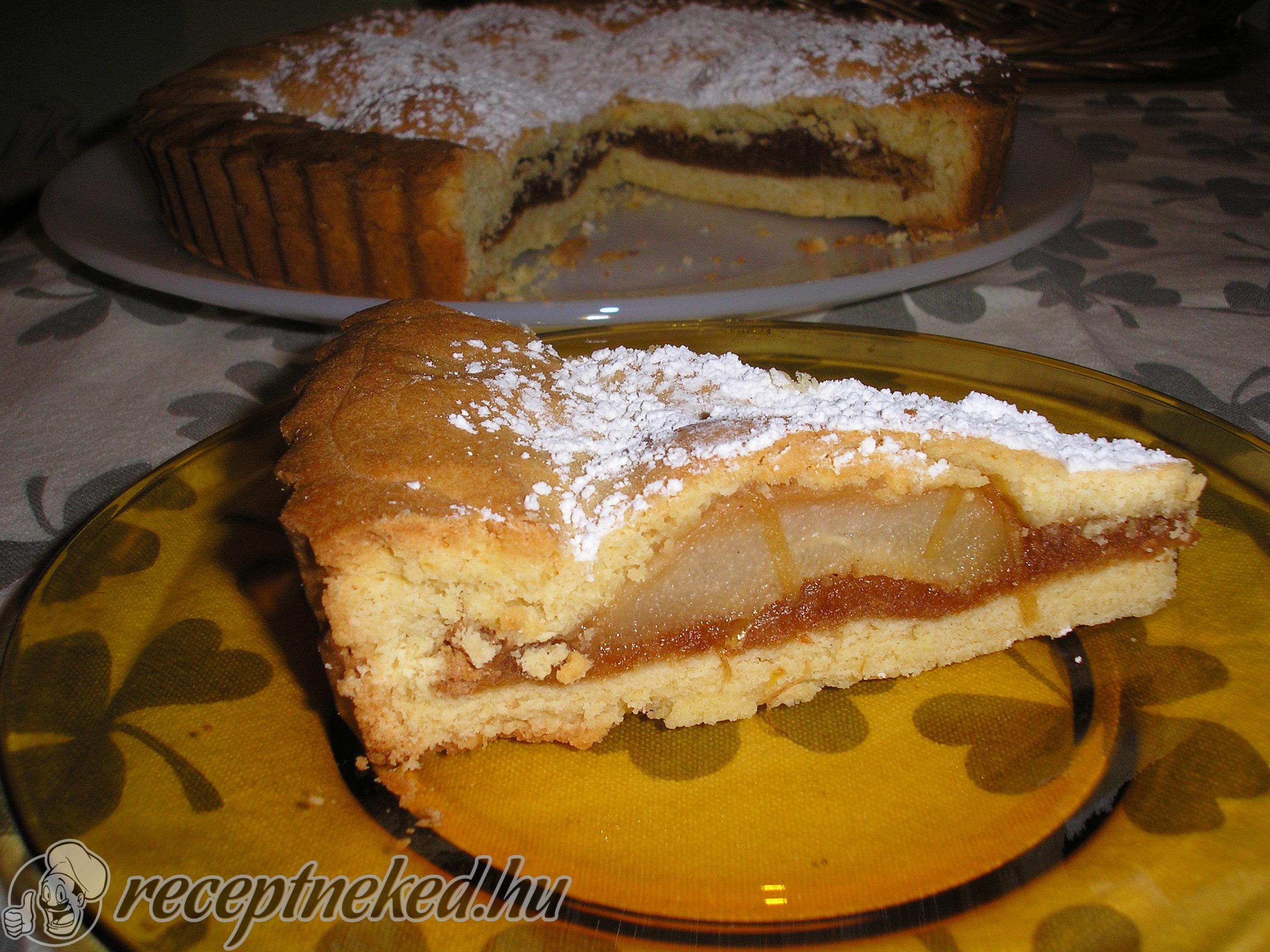 Felolvasztjuk a vajat a maradék cukorral, egy csipet fahéjjal és az őrölt gyömbérrel. A tészta kétharmadát 1 cm vastagra nyújtjuk. 24 cm átmérőjű, kivajazott tortaformába tesszük, rászórjuk az összetört kalácsot, vagy édes morzsát, és ráhelyezzük a körtéket. Meglocsoljuk fűszeres vajjal. Kinyújtjuk a maradék tésztát, a torta tetejére tesszük, lenyomkodjuk a széleit, és 180 fokon 30 perc alatt készre sütjük.