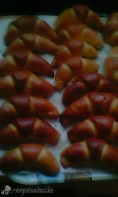 A sütőt 180 fokra bekapcsoljuk. A kifliket lekenjük a félretett tojással (ízlés szerint a tetejére szórhatunk egész mákot is).