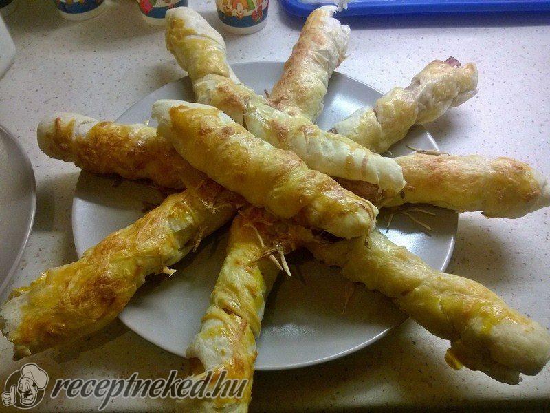 Ezt a műveletet összesen 4-szer végezzük el, majd egy ujjnyi vastagra sodorjuk a tésztát, majd a szükséges mennyiségből 1 cm széles és 5 cm hosszú csíkokat vágunk, sütőpapíros lemezre téve 180 fokra előmelegített sütőben aranyszínűre sütjük.