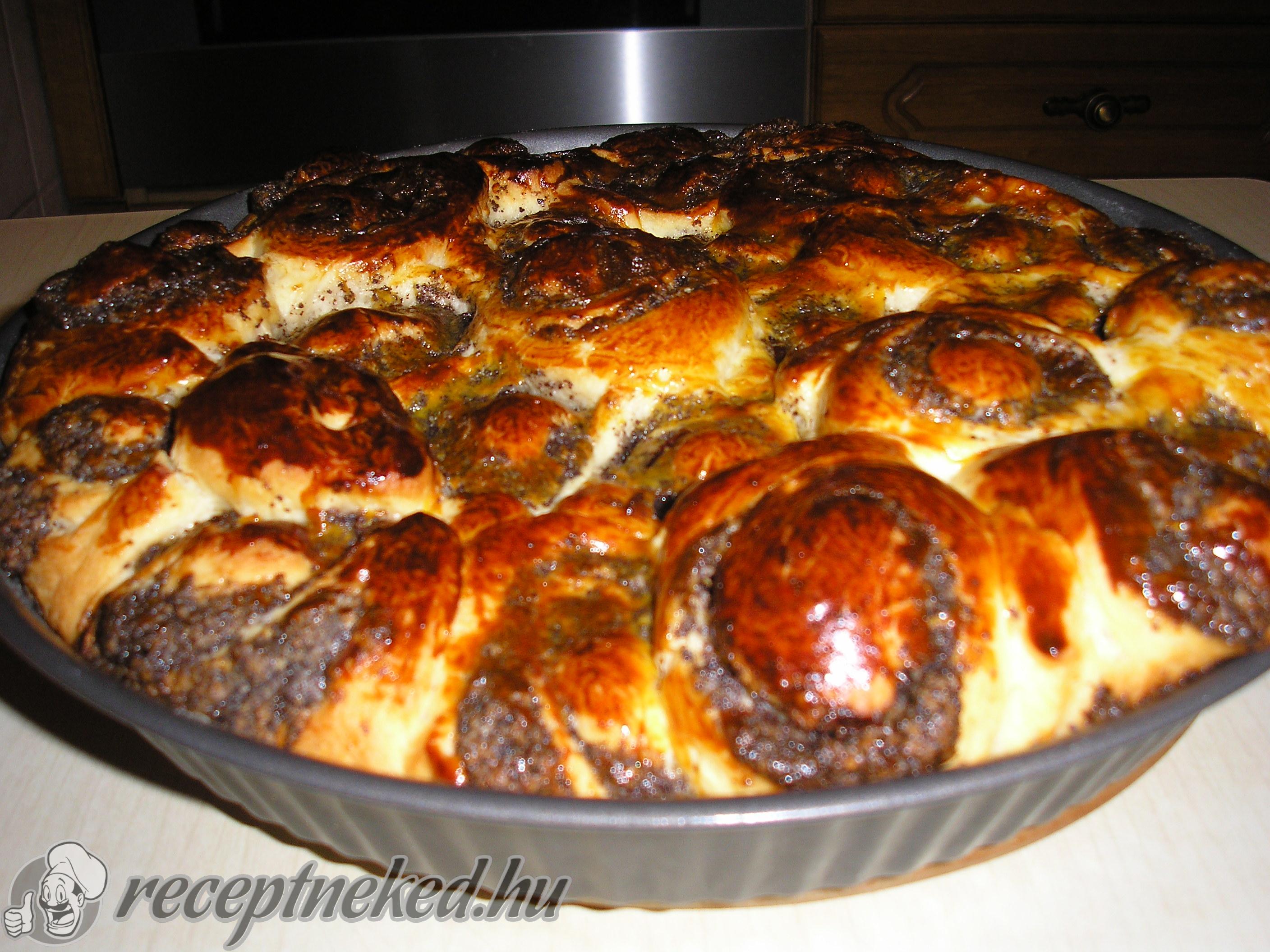 A tésztákat lisztezett deszkán kinyújtjuk téglalap alakúra. Megkenjük a meggyes máktöltelékkel és feltekerjük. A maradék tésztát is kinyújtjuk és megtöltjük a töltelékkel, majd feltekerjük. A feltekert tésztákat olyan vastagra szeljük, mint amekkora a sütőforma pereme.