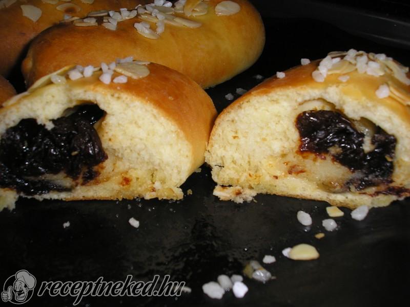 A tésztagolyót ovális lappá nyújtom, ráteszek 3 db aszaltszilvát és a vékonyra sodort marcipán rudat. Keskenyebb részénél fogva feltekerem, úgy, hogy a hajtás vége alul maradjon. Megkenem tojásfehérjével, hogy véletlen se nyíljon szét. Sarkait összecsípem, alányomom. Sütőpapírral bélelt sütőlemezre teszem, és letakarva 45 percig kelesztem.