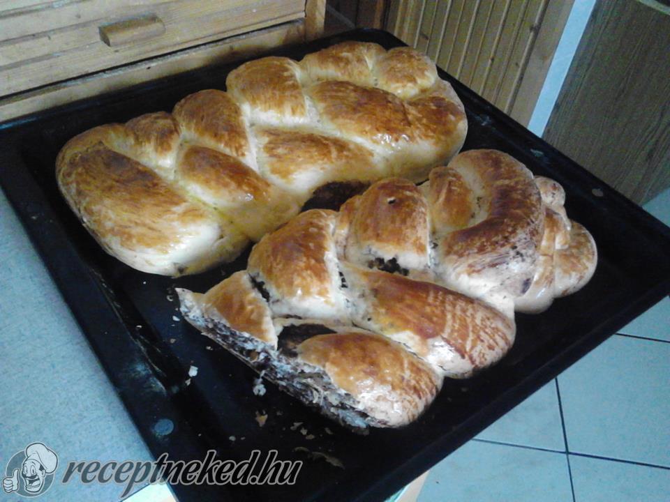 A megkelt tésztákat kettévágom. A sütőformába teszek egy fehér tésztát, majd mellé egy kakaósat. Ezt megismétlem. Végül hagyom kelni a tésztát, addig a sütőt előmelegítem 200 fokra.