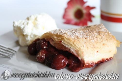 A leveles tésztát kinyújtjuk. A darált mákot összekeverjük a cukorral (kóstoljuk meg, hogy elég édes a meggy, lehet, hogy kevesebb kell), eloszlatjuk egyenletesen a kinyújtott leveles tésztán, majd rászórjuk a meggyet. Feltekerjük, mint a palacsintát és beletesszük a tepsibe, majd megkenjük a felvert tojással. Előmelegített sütőben 180 fokon kb 20 percig sütjük.
