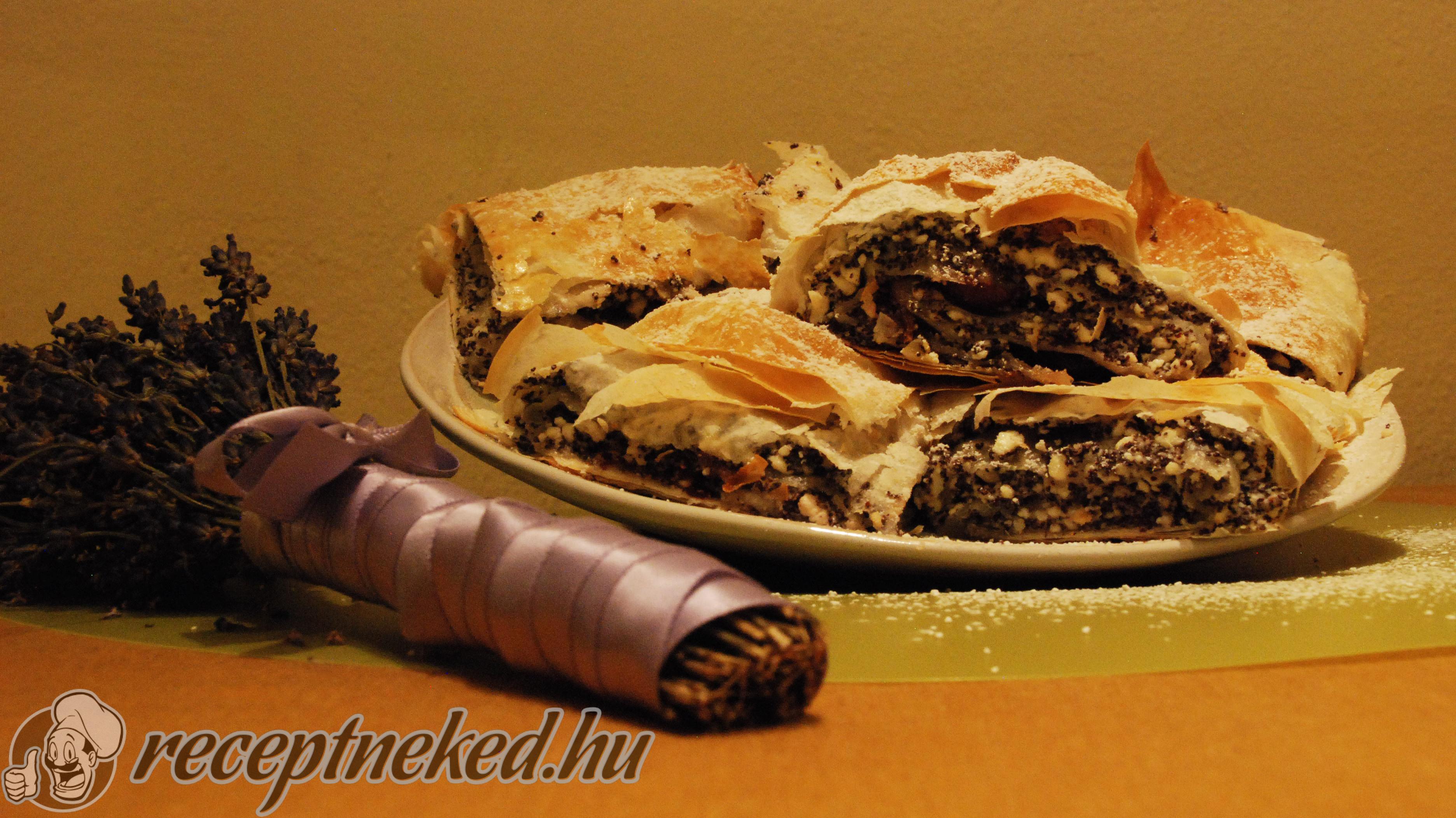 A darált mákot összekeverjük a cukorral (kóstoljuk meg, hogy elég édes a meggy, lehet, hogy kevesebb kell), eloszlatjuk egyenletesen a kinyújtott leveles tésztán, majd rászórjuk a meggyet.