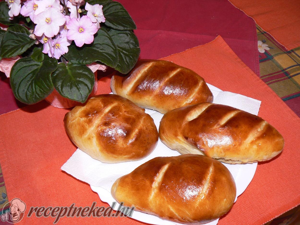 A megkelt tésztát lisztezett deszkán 9 részre osztjuk, egyenként cipókat formázunk belőlük. A kis cipókat sütőpapírral bélelt tepsire tesszük, bevagdossuk, majd felvert tojással lekenjük.