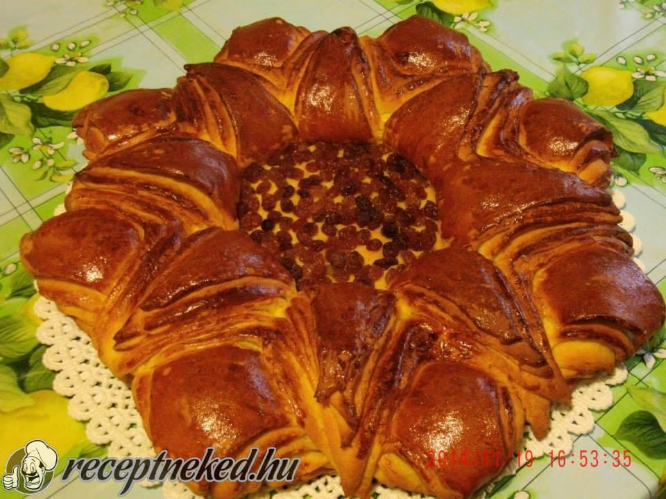 Kb 30 percig tovább kelesztjük, majd tojás sárgájával megkenjük. Előmelegített 180 fokos sütőben kb 3/4 óra alatt aranybarnára sütjük.