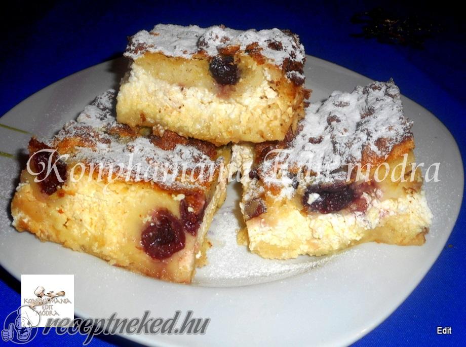 Rászórjuk a túrót és a tejfölt rálocsoljuk. Rászórjuk a magozott meggyet, meghintjük a fahéj és a kristálycukor keverékével, végül rászórjuk a maradék lisztes keveréket. A maradék vajat is rádaraboljuk.