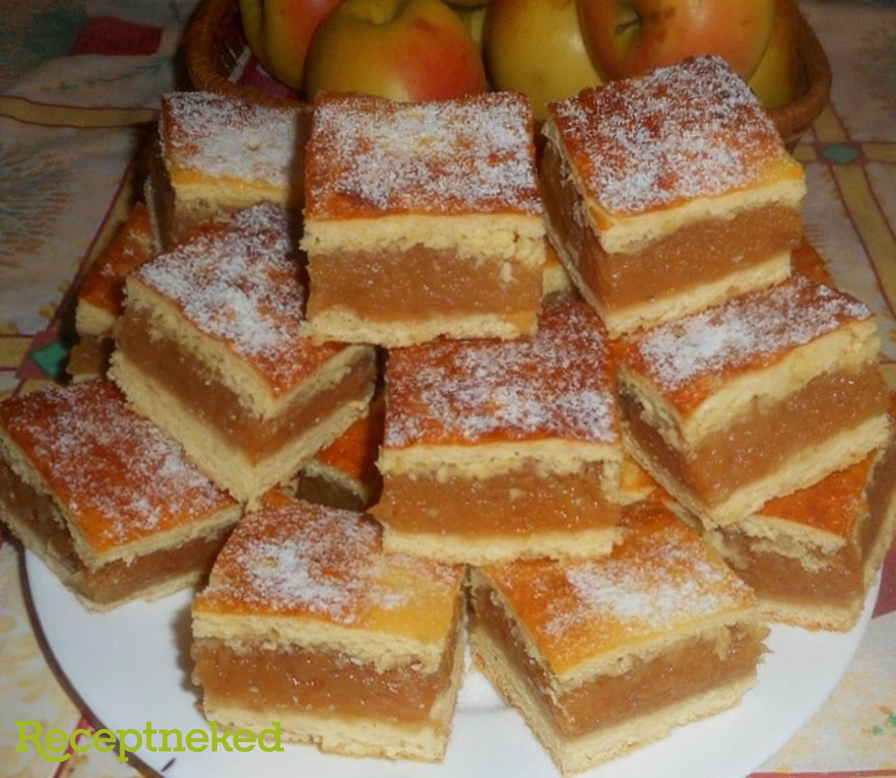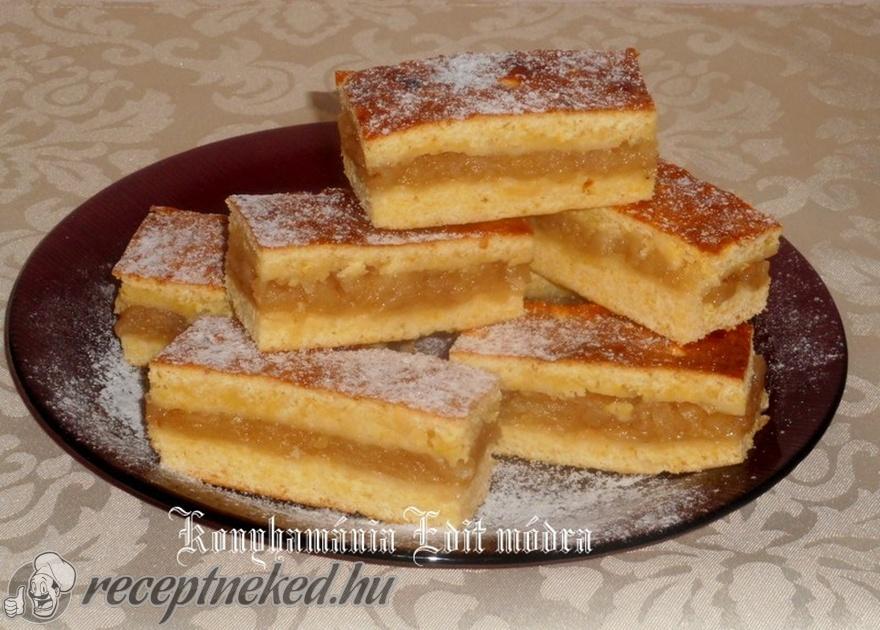 Egy 25*35 cm-es tepsit kivajazunk és lisztezünk, majd beleterítjük az egyik kinyújtott tésztát. Rásimítjuk a kihűlt almát, majd befedjük a másik kinyújtott lappal.