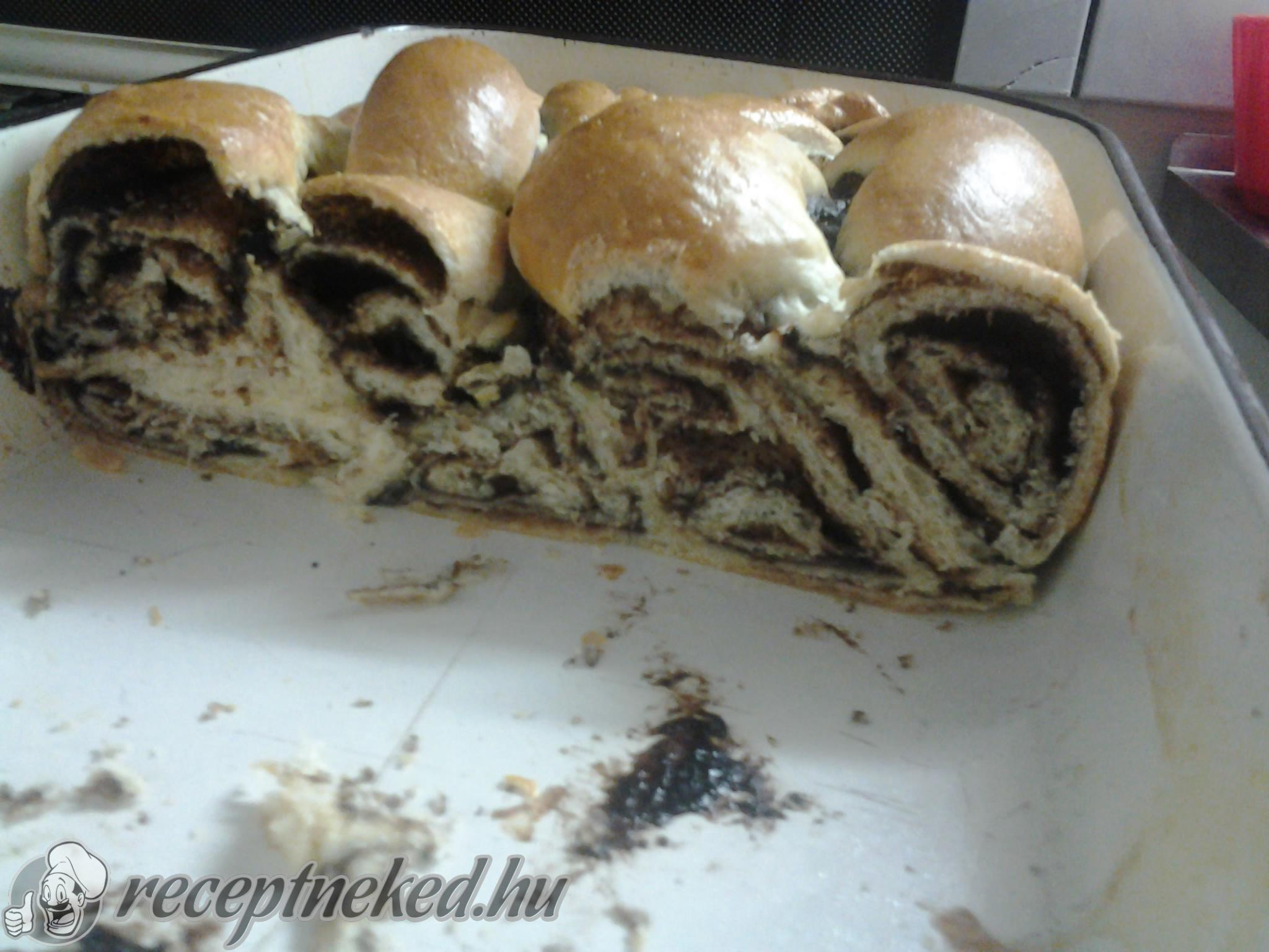A megkelt cipókat egyenként vékonyra nyújtjuk, megkenjük a kakaós krém hatodával, majd feltekerjük. Három-három rudat összefonunk, és olajjal kikent tepsibe tesszük. A sütőt előmelegítjük, addig még hagyjuk a kalácsokat kicsit kelni. A tetejüket felvert tojással megkenjük, és 170 °C-on aranybarnára sütjük.