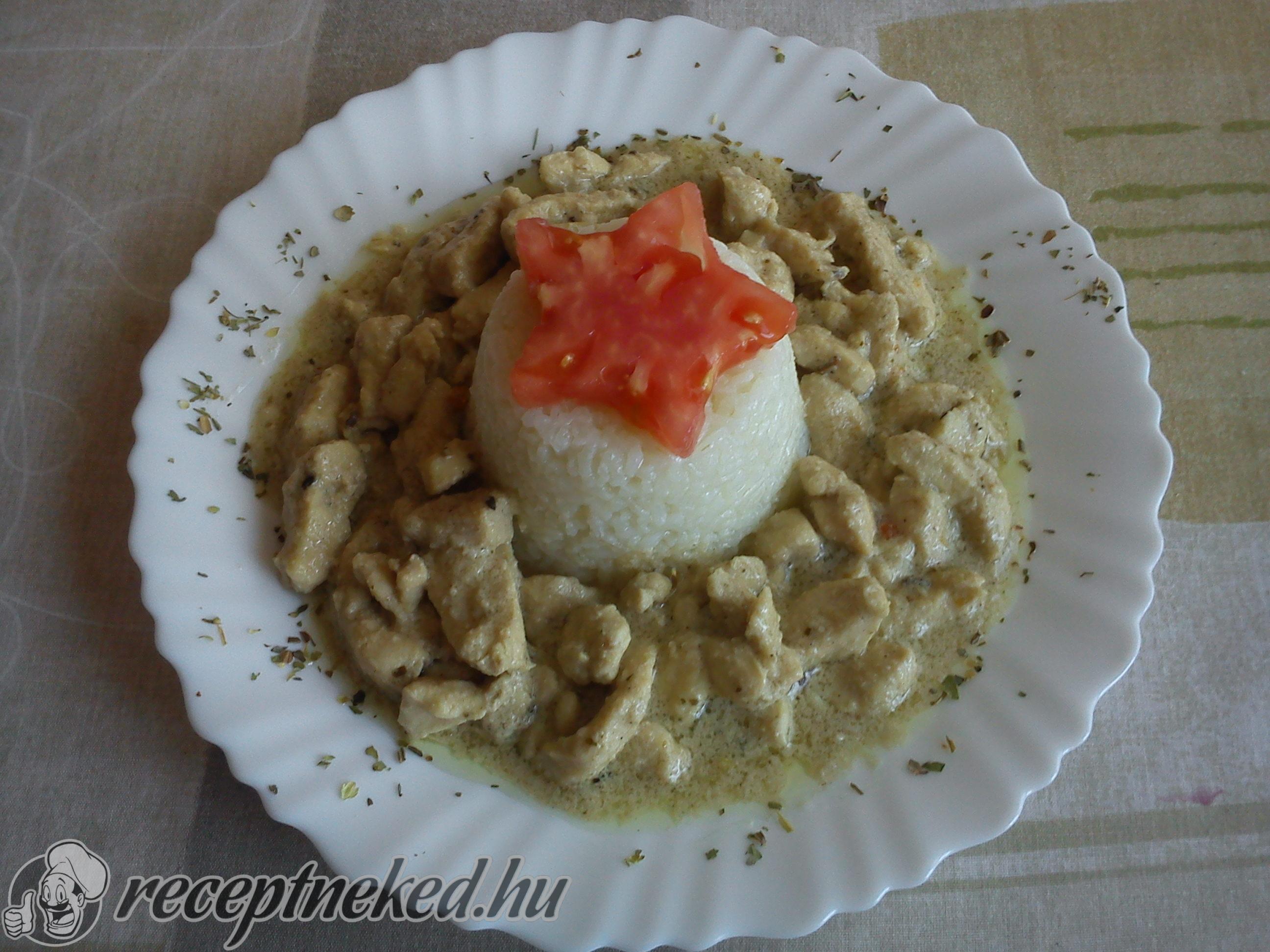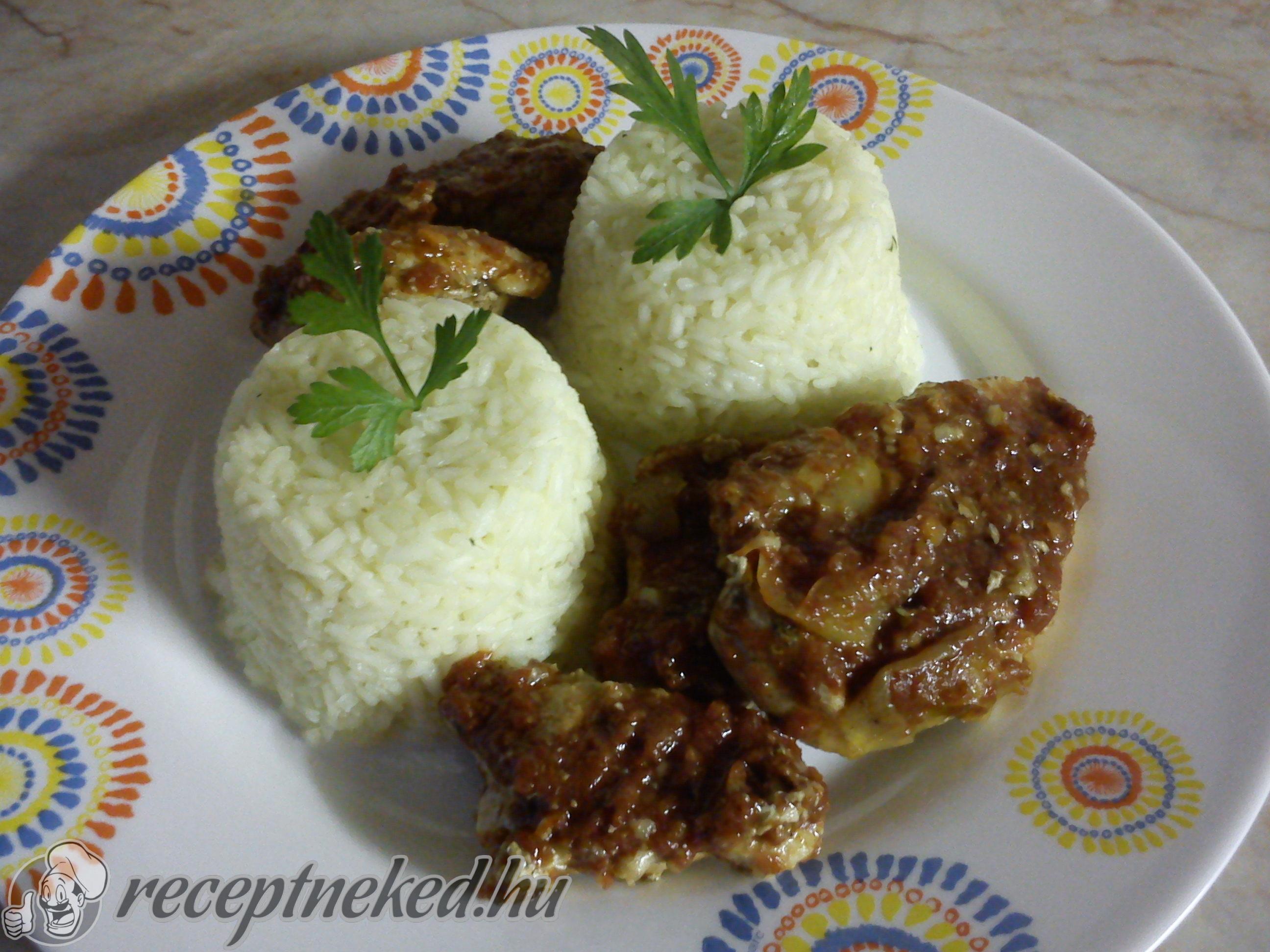 A húst felszeleteljük, a szeleteket visszatesszük a szaftba, lefedjük és átforrósítjuk. Végül tányérokra rendezzük, meglocsoljuk a szafttal és a zöldségekkel, valamint a rizzsel kínáljuk.