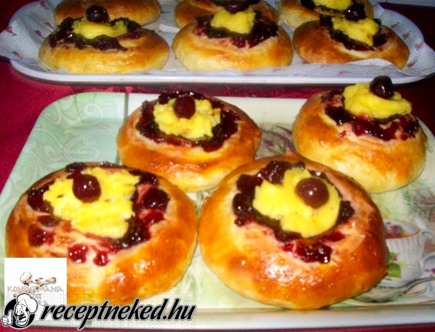 A megkelt tésztát lisztezett felületen átgyúrjuk és kb 1 cm vastagságúra kinyújtjuk. Egy (7-8 cm-es) szaggatóval kiszaggatjuk. Egy kisebb átmérőjű pohár segítségével a pohár aljával a kiszaggatott tészta közepét lenyomjuk (mélyedéseket készítünk, de legyen pereme is).