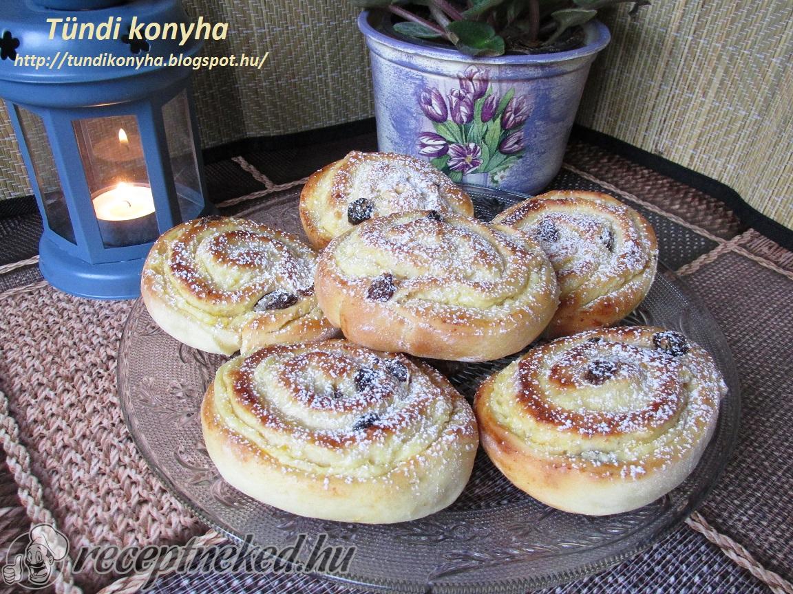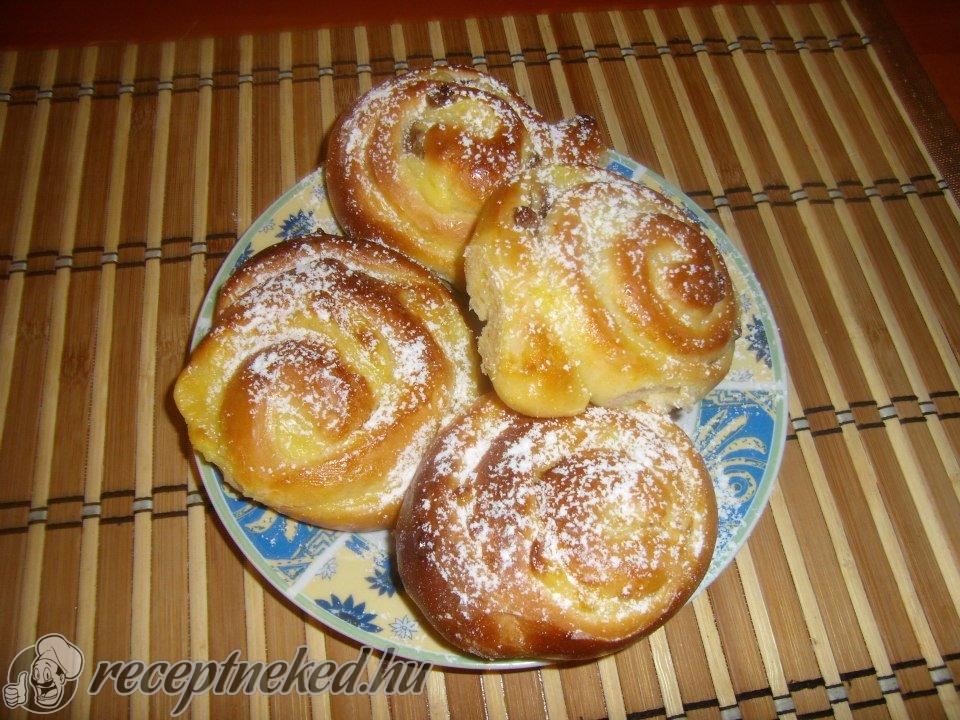 Ha a tészta pihent legalább fél órát és elkezdett kelni, akkor lisztezett deszkán nyújtsuk ki vékony téglalappá és kenjük egyenletes rá a kihűlt pudingot. Tekerjük óvatosan fel a tésztát, vigyázva, hogy a pudingot ne nyomjuk ki belőle, majd vágjuk fel egyforma kb 2 ujjnyi széles darabokra.