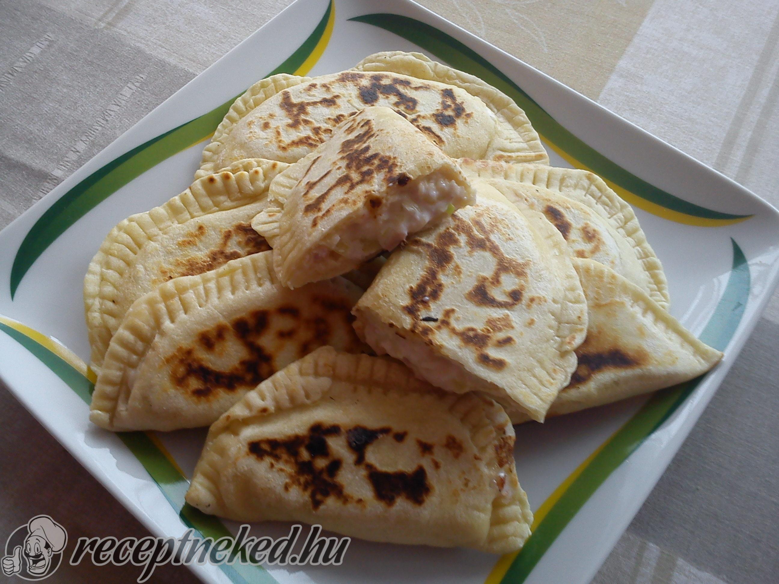A lisztet, sütőport, sót, vizet és olajat egy tálban összekeverjük, majd összegyúrjuk. A tésztát letakarva rövid ideig pihentetjük, amíg elkészítjük a tölteléket.