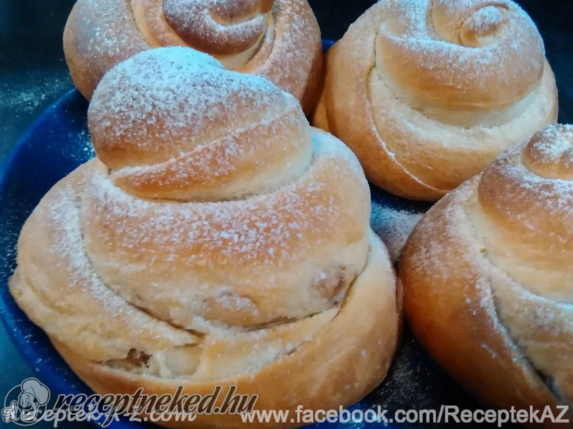 Mikor mindegyiket feltekertük, csigákat formázunk belőlük (a hajtás a tetejére kerüljön), a végét összecsípjük, és a csiga alá tesszük.