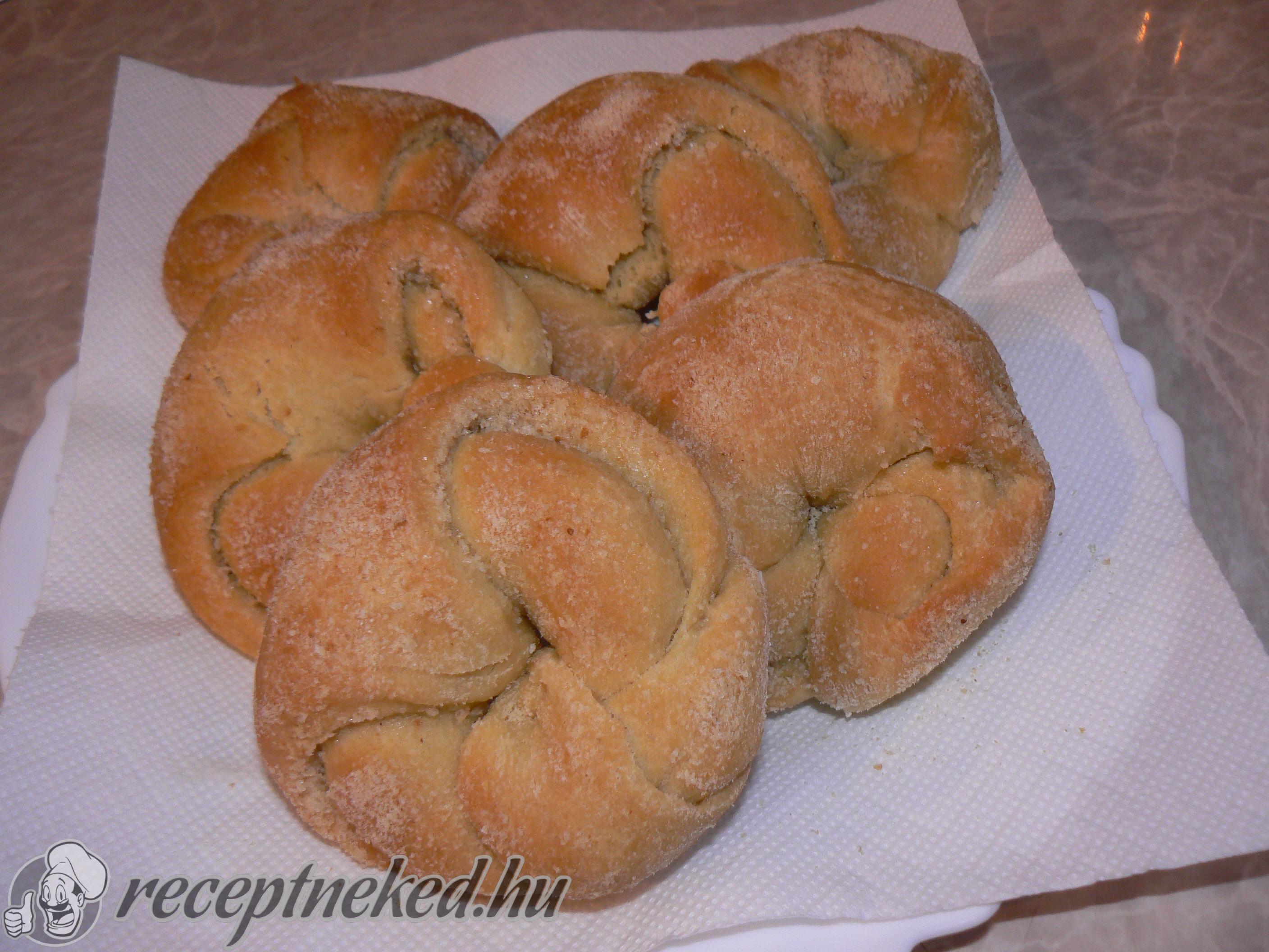 A megkelt tésztát lisztezett felületre borítjuk, átgyúrjuk, elosztjuk 4 egyforma részre, és gömbölyűre gyúrjuk. Mindegyiket kinyújtjuk kör alakúra, megkenjük az olvasztott vajjal, meghintjük a zsemle morzsa-cukor-vaníliás cukor keverékével.