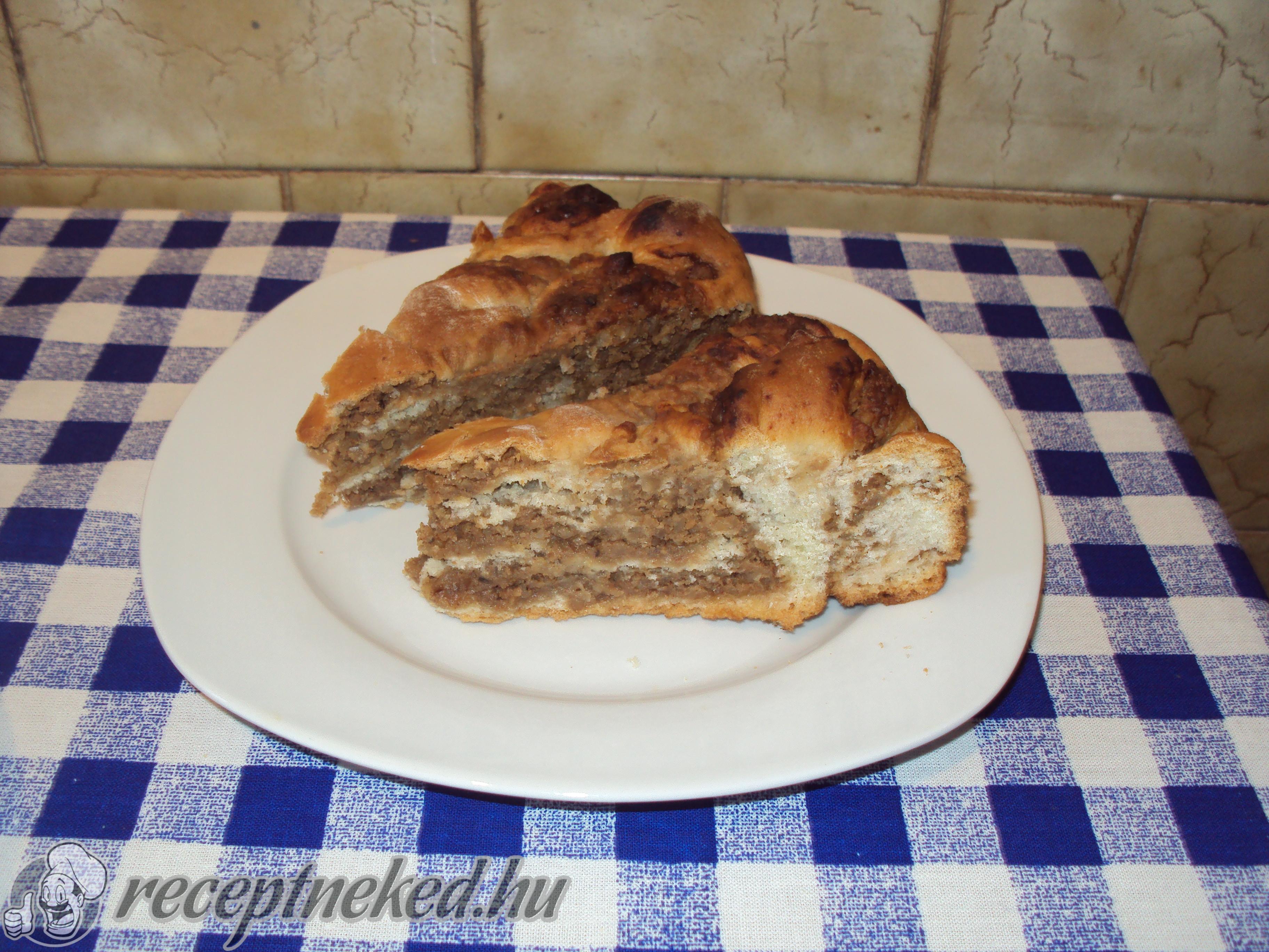 Az utolsó réteget, mely a fedőréteg lesz, felvert tojással kenjük meg és szórunk rá cukros diót is. Egy újabb félórás pihentetés után 180 fokos sütőben, légkeverésen szép pirosra sütjük.