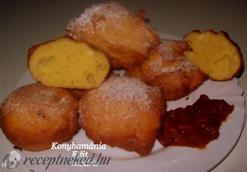 Lassú tűznél, fedő alatt, gyakran forgatva szép pirosra sütjük. (Nekem ebből az adagból 12 darab lett.) Kissé meghintve porcukorral és baracklekvárral fogyasztottuk.