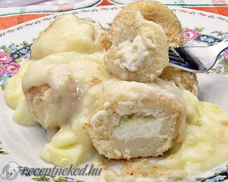 Pirított zsemlemorzsába forgatjuk, és a vaníliasodóval tálaljuk. Megszórhatjuk porcukorral is.