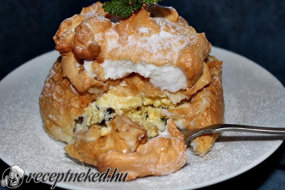 Egy tepsit béleljünk ki sütőpapírral, majd helyezzük rá a tejbe mártott zsemléket. Ezután töltsük meg mindegyiket az ízesített túróval, majd helyezzük vissza a levágott zsemle szeletet. Végül halmozzuk rá a keményre felvert tojásfehérje habot.
