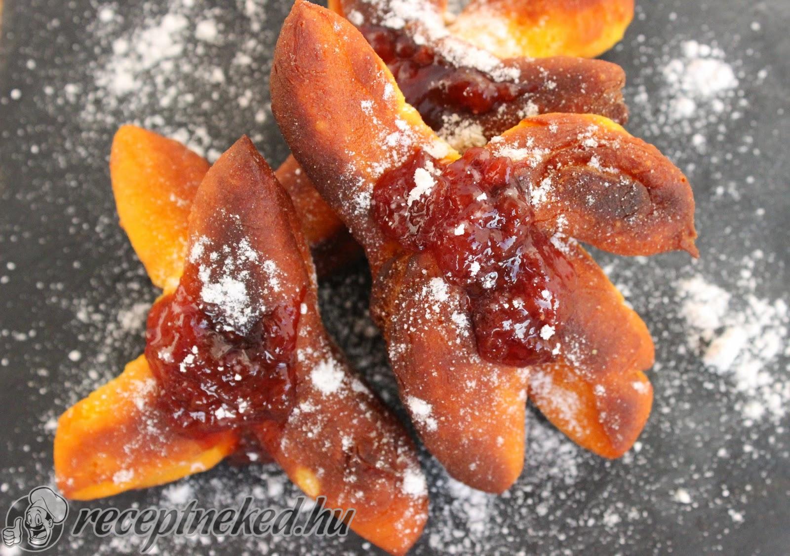 Forró, bő olajban oldalanként 1-1 percig sütjük, majd papírtörlőre kiszedjük és végül melegen tálaljuk egy-egy kanálka lekvárral és fahéjas porcukorra.