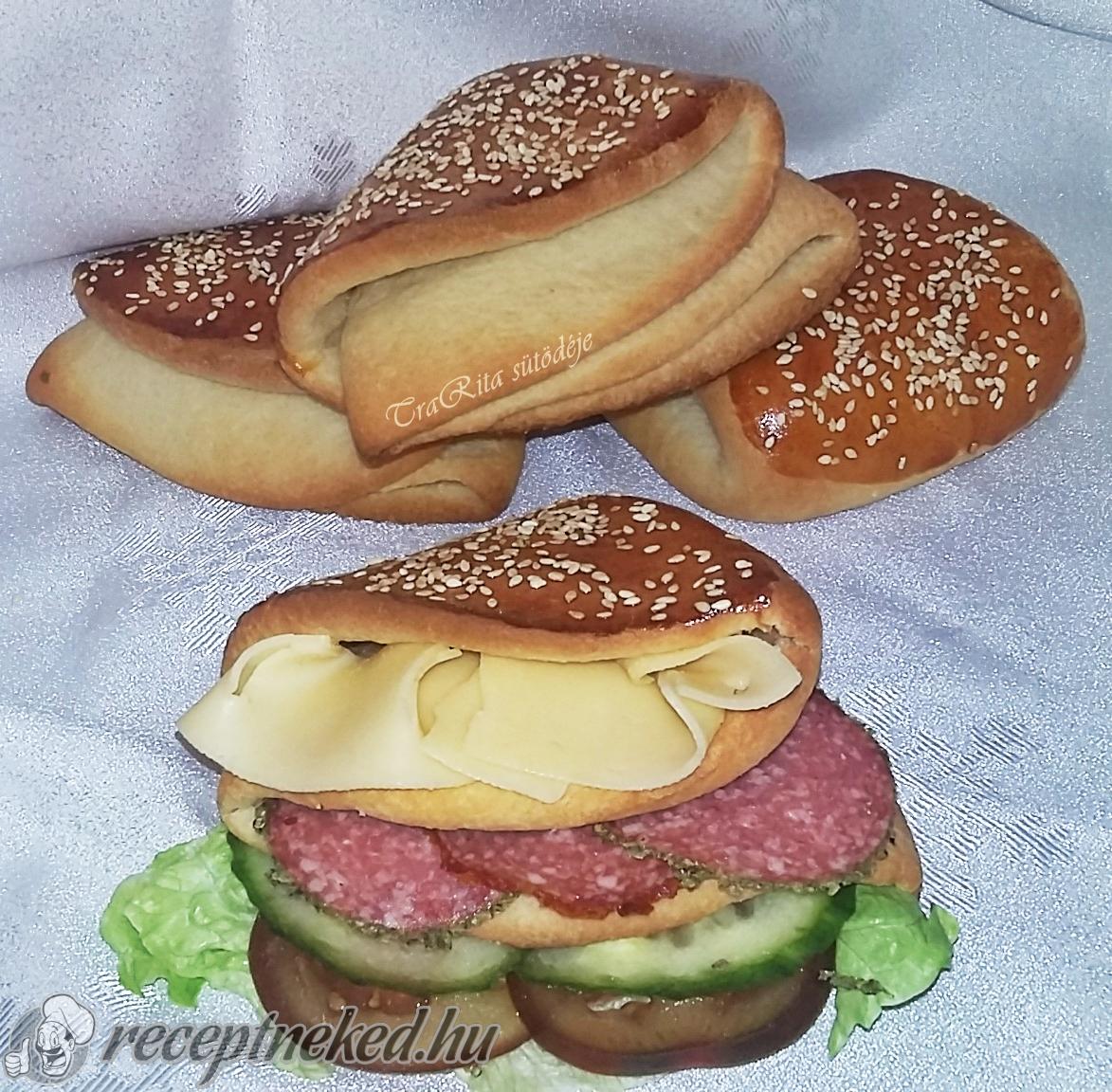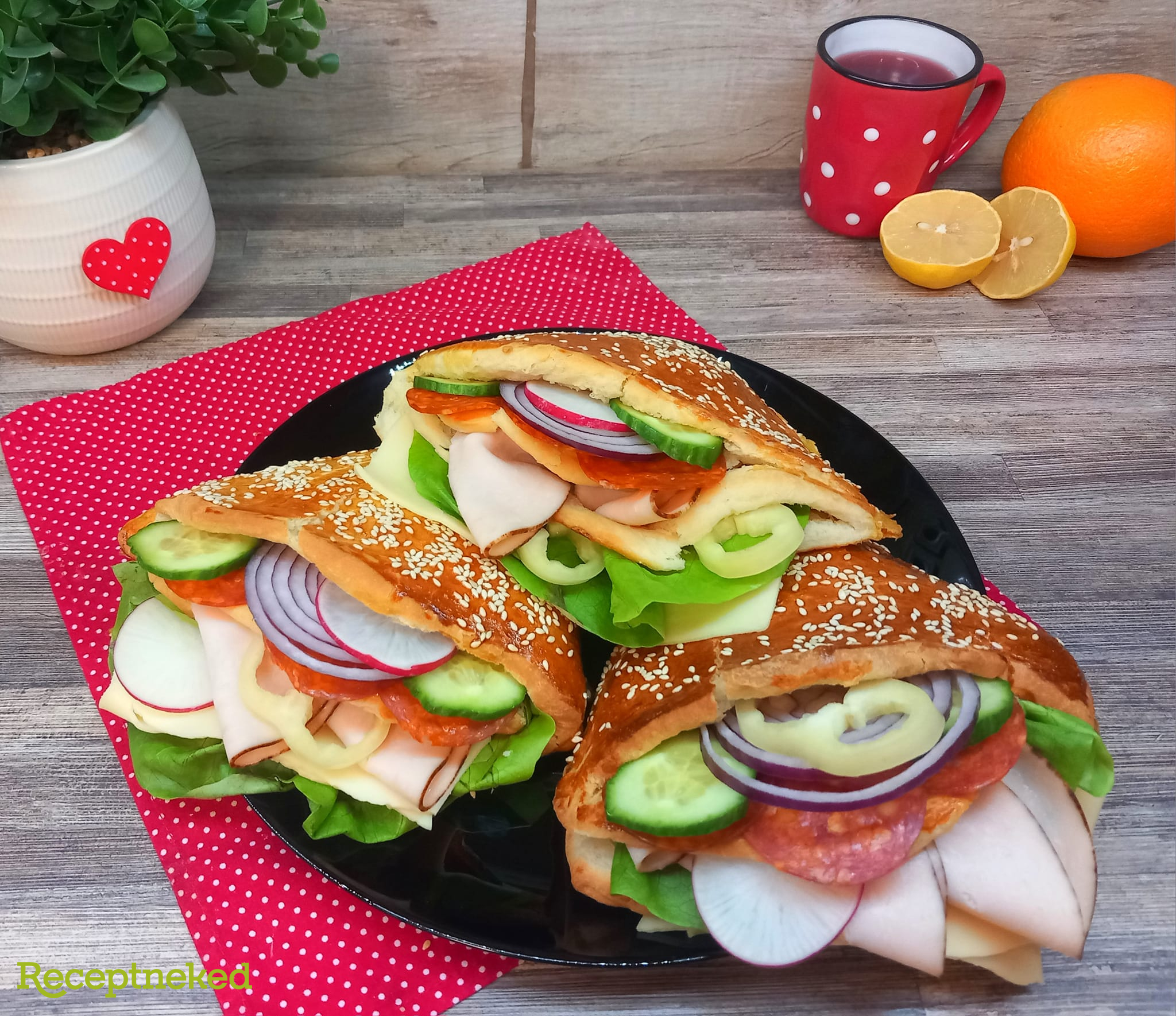 Sütőből kivéve picit lespricceljük vízzel. Ha kihűlt ízlés szerint rakunk bele szalámit, sajtot, hagymát, uborkát, stb.