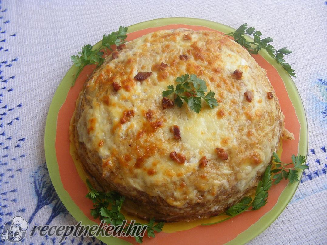 Az első palacsintát tejföllel megkenjük, és reszelt sajttal megszórjuk. Ezután ráhelyezzük a következő palacsintát, amelyet szintén megkenünk tejföllel, de itt reszelt sajt helyett sonkát szórunk rá. Ezt a rétegezést addig folytatjuk, amíg el nem fogynak a palacsinták.