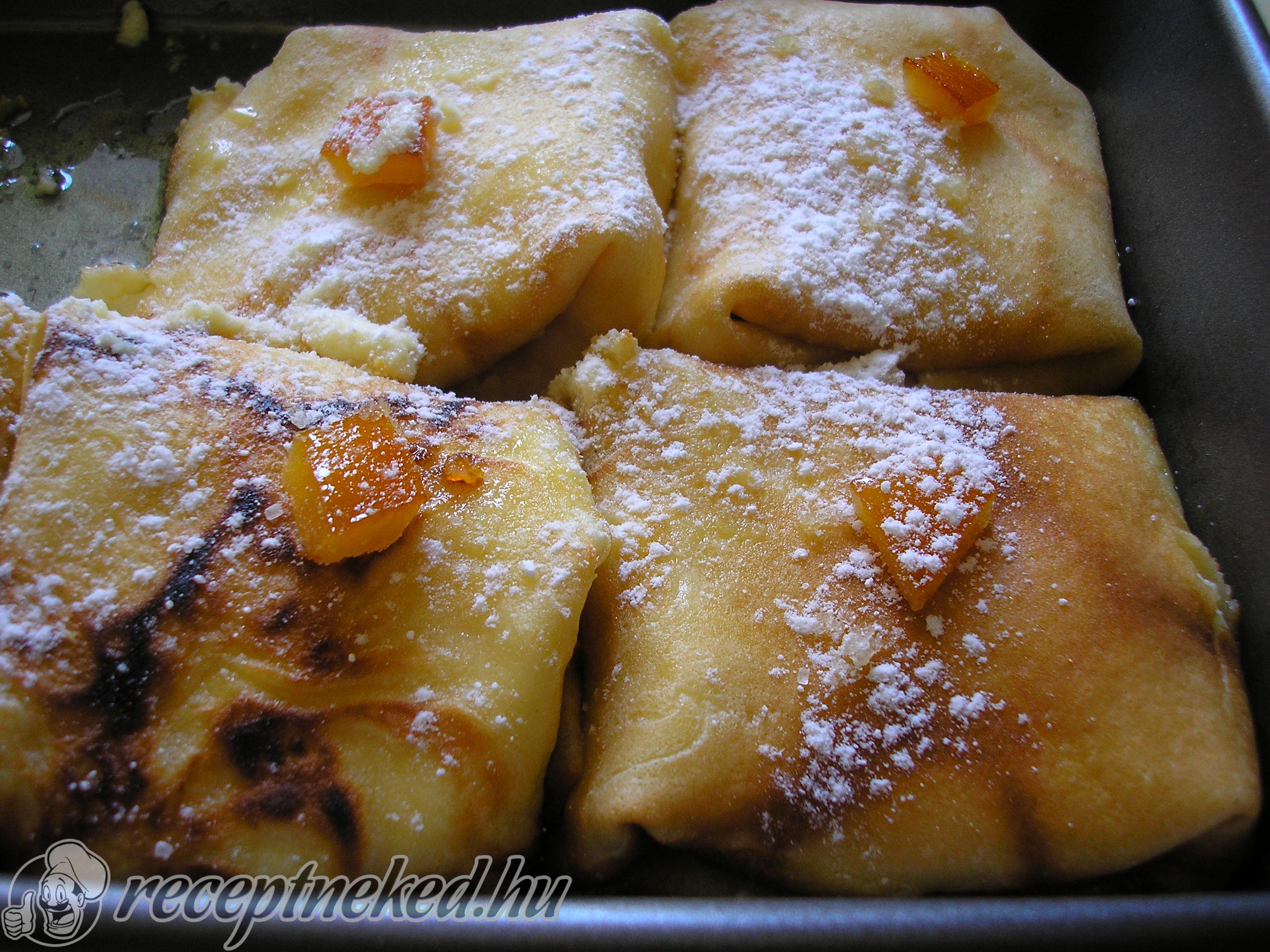 A kisült palacsintákat hajtsuk össze, majd helyezzük bele a narancsszószba és hagyjuk hogy kissé magába szívja a szószt.