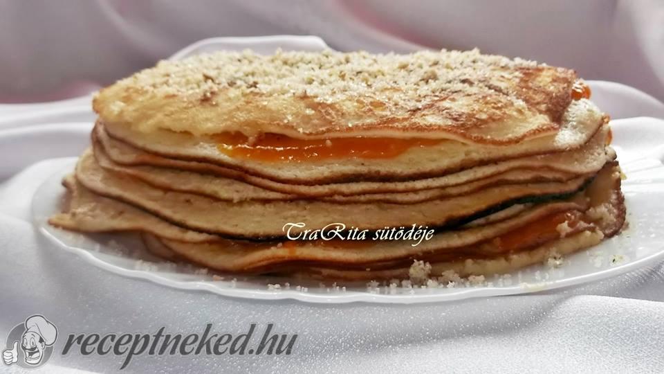 Megkenjük lekvárral, megszórjuk a dióval. És így tovább. Az utolsó palacsintát a sült oldalával felfelé tesszük a tetejére és megszórjuk dióval.