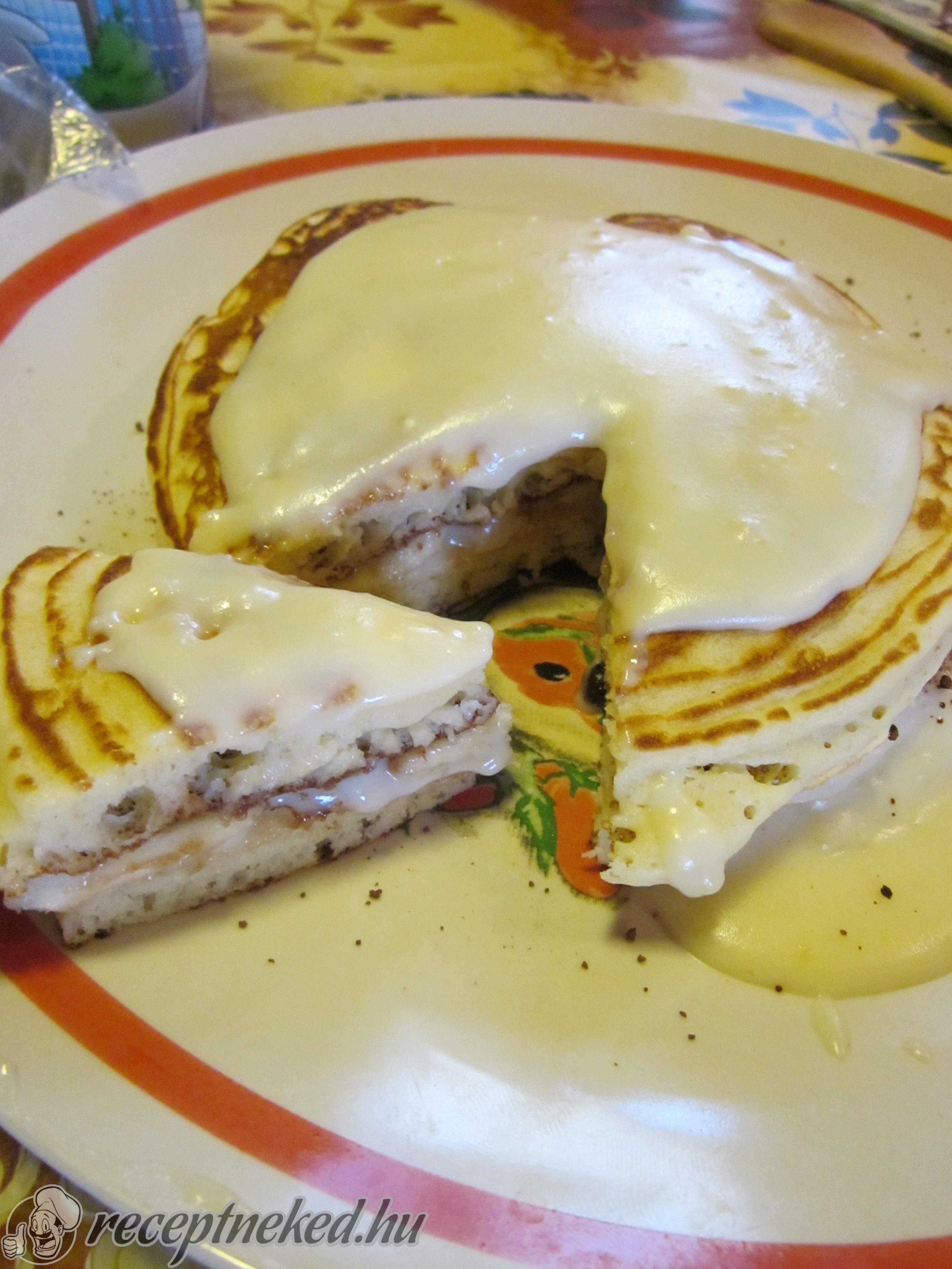 Egy palacsintát tányérra helyezünk, rákenünk egy adag vaníliakrémet, majd banánszeletekkel kirakjuk, megszórjuk kakaóporral. Újabb palacsinta kerül a tetejére, majd ismét krém, banán és kakaó. A rétegezést addig folytatjuk, amíg el nem fogynak a hozzávalók. A tetejére egy kevés vaníliakrém kerül, díszítésként kakaóporral meghintve.