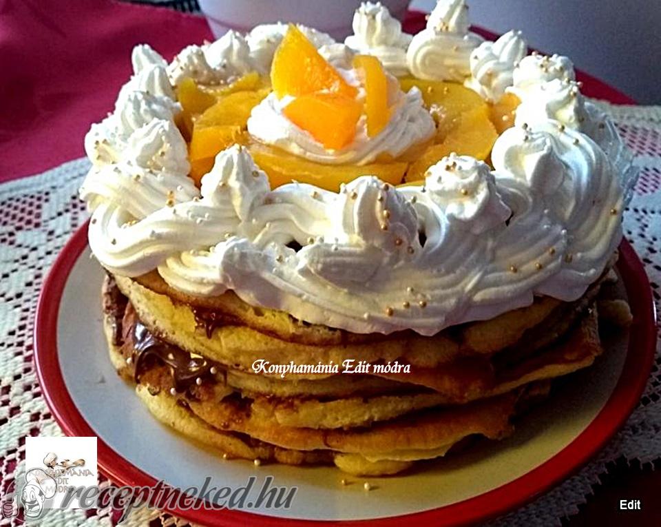 8 palacsintát teszünk egymásra, miközben mogyorókrémmel megkenünk minden darabot és a tetejét is. A tetejét kirakjuk a szeletekre vágott barackkal.