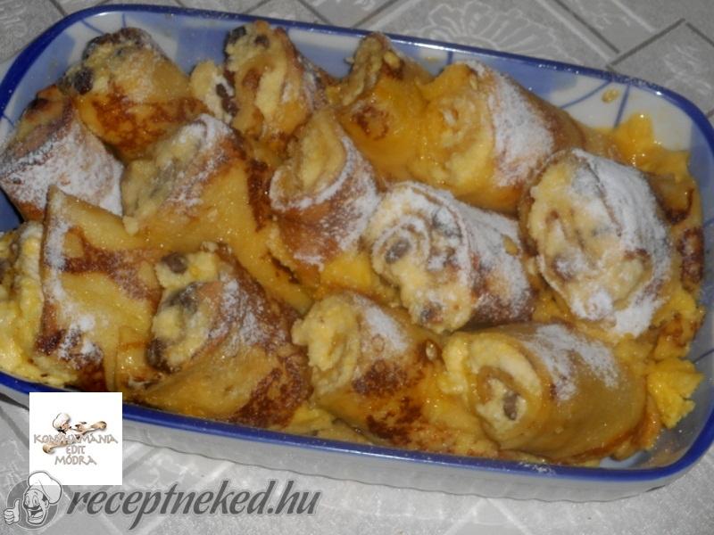 A kisült palacsintákat töltsük meg a töltelékkel, tekerjük fel, majd vágjuk ketté és helyezzük jénaiba, úgy hogy a vágott felület legyen felül.