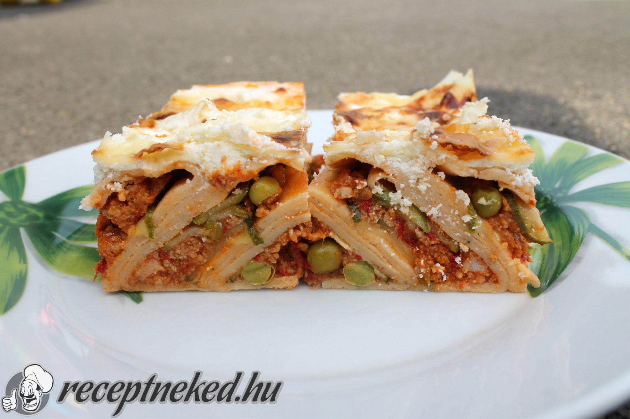 Az olajon a hagymát megdinszteljük, majd mintha bolognai szószt készítenénk, elkészítjük a darált húst. A pirospaprikás hagymán fehéredésig kevergetjük a darált húst, majd fűszerezzük és felöntjük paradicsompürével és kevéske vízzel. Itt én beledobtam egy passzírozott sült paprikát is az íze miatt. Annyit öntsünk rá, hogy ne legyen túl szaftos, de a körülbelüli 20 perc rotyogás alatt se főjön el teljesen a szaftja. A vége felé beledobjuk a zöldborsót (nekem fagyasztott volt).